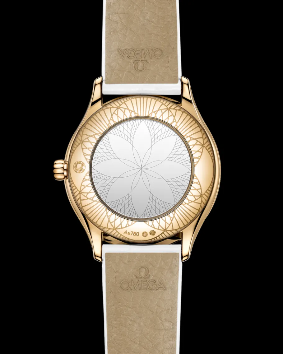 Elle repose sur un bracelet en cuir d’alligator blanc laqué fermé par une boucle Trésor. Elle est entraînée par le calibre OMEGA 4061, dissimulé par un fond de boîte miroir exclusif orné du motif métallisé « Her Time ».