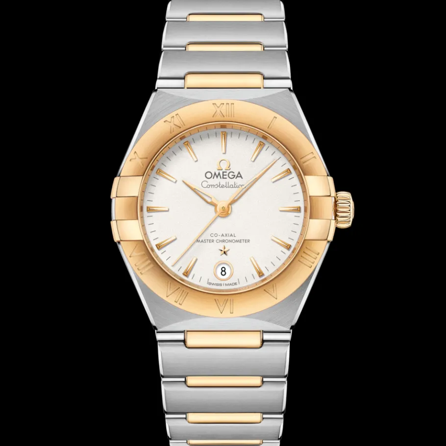 Ce modèle en acier inoxydable et or jaune 18K de 29 mm arbore une lunette gravée de chiffres romains, un cadran blanc cristal argenté et un guichet de date à 6 heures. Les aiguilles, le logo OMEGA, l’étoile Constellation et les index sont également façonnés en or jaune 18K.