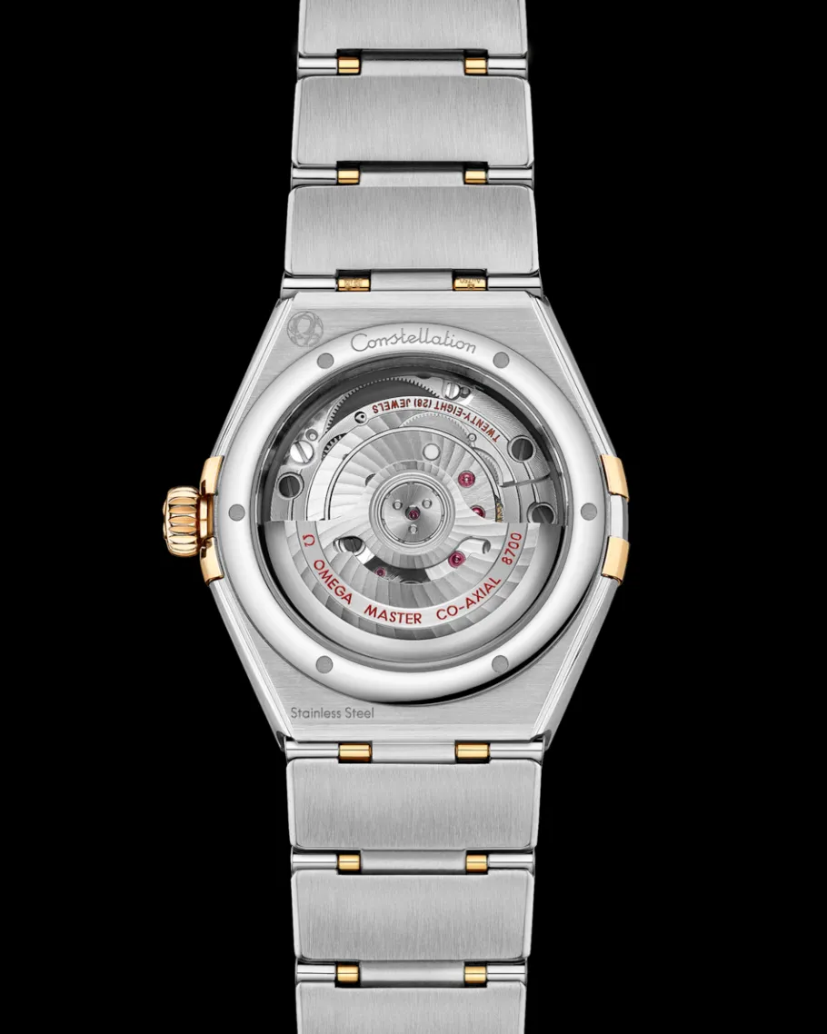 Cette montre abrite un calibre OMEGA Co-Axial Master Chronometer 8700, visible à travers le fond du boîtier en verre saphir bombé résistant aux rayures.