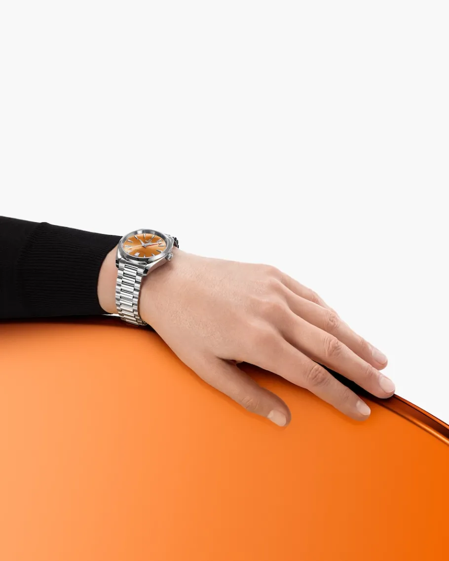Le cadran couleur safran, façonné à partir de laiton, est revêtu de laque et soleillé à partir du centre. Agrémenté d’aiguilles et d’index rhodiés revêtus de Super-LumiNova blanc, il affiche un guichet de date à 6 heures.