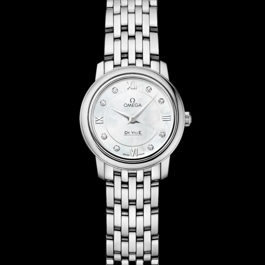 Le boîtier de 24,4 mm en acier inoxydable repose sur un bracelet « Prestige » en acier inoxydable poli. La montre est entraînée par le calibre 1376 OMEGA, un mouvement à quartz de précision dont la pile possède une durée de vie de 48 mois.