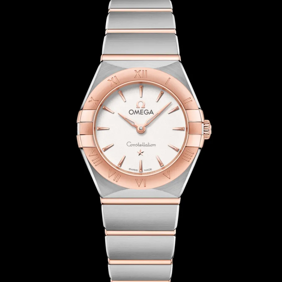 Ce modèle en acier inoxydable et or Sedna™ 18K de 25 mm arbore une lunette gravée de chiffres romains, un cadran blanc cristal argenté et un verre saphir résistant aux rayures. Les aiguilles, le logo OMEGA, l’étoile Constellation et les index sont également façonnés en or Sedna™ 18K.