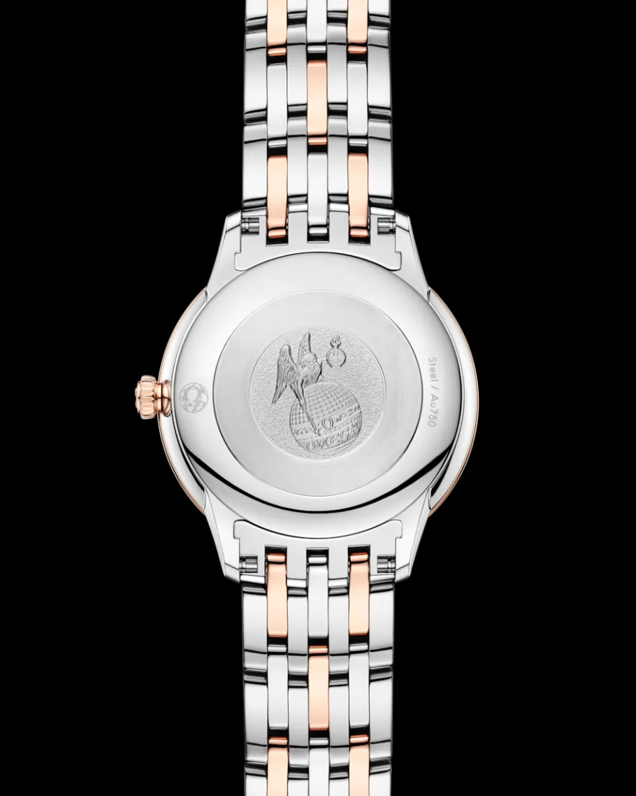 Cette montre est montée sur un bracelet en acier inoxydable et en or Sedna™ et est animée par le calibre à quartz OMEGA 4061, équipé d’une pile d’une durée de vie d’au moins 48 mois.