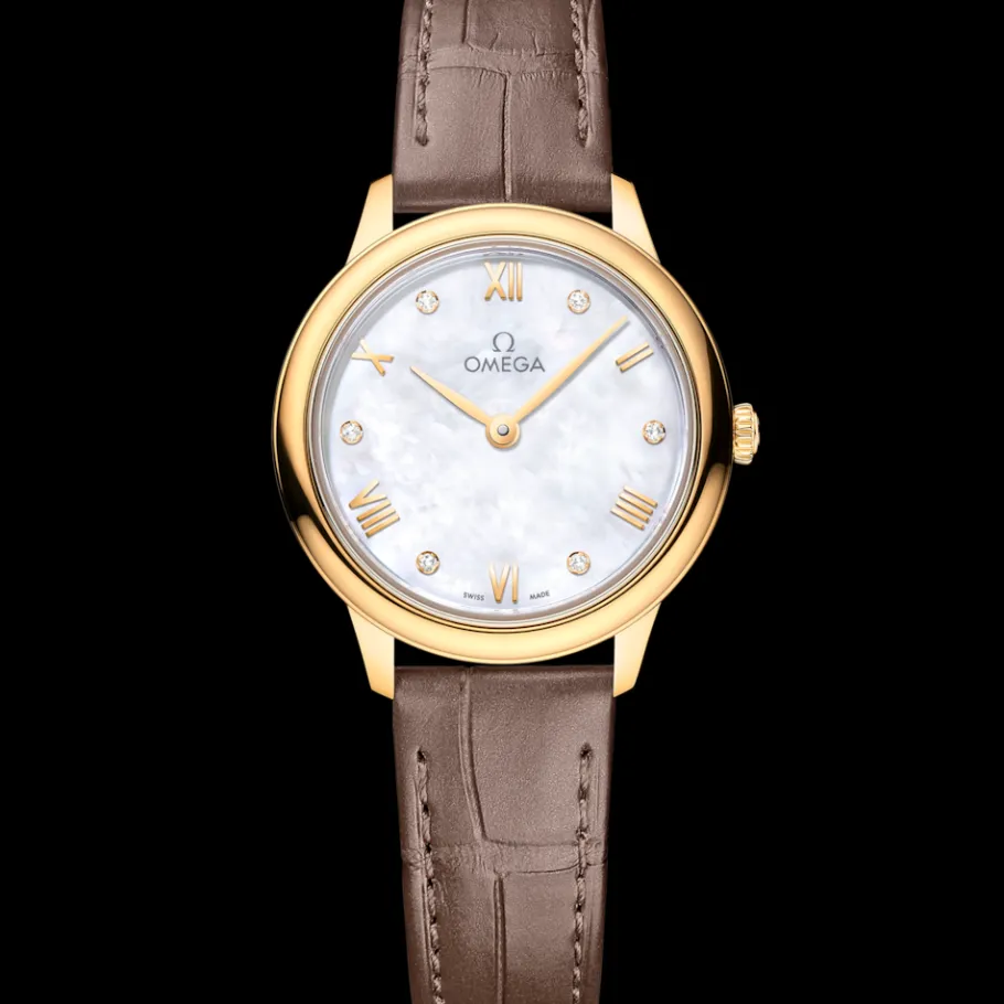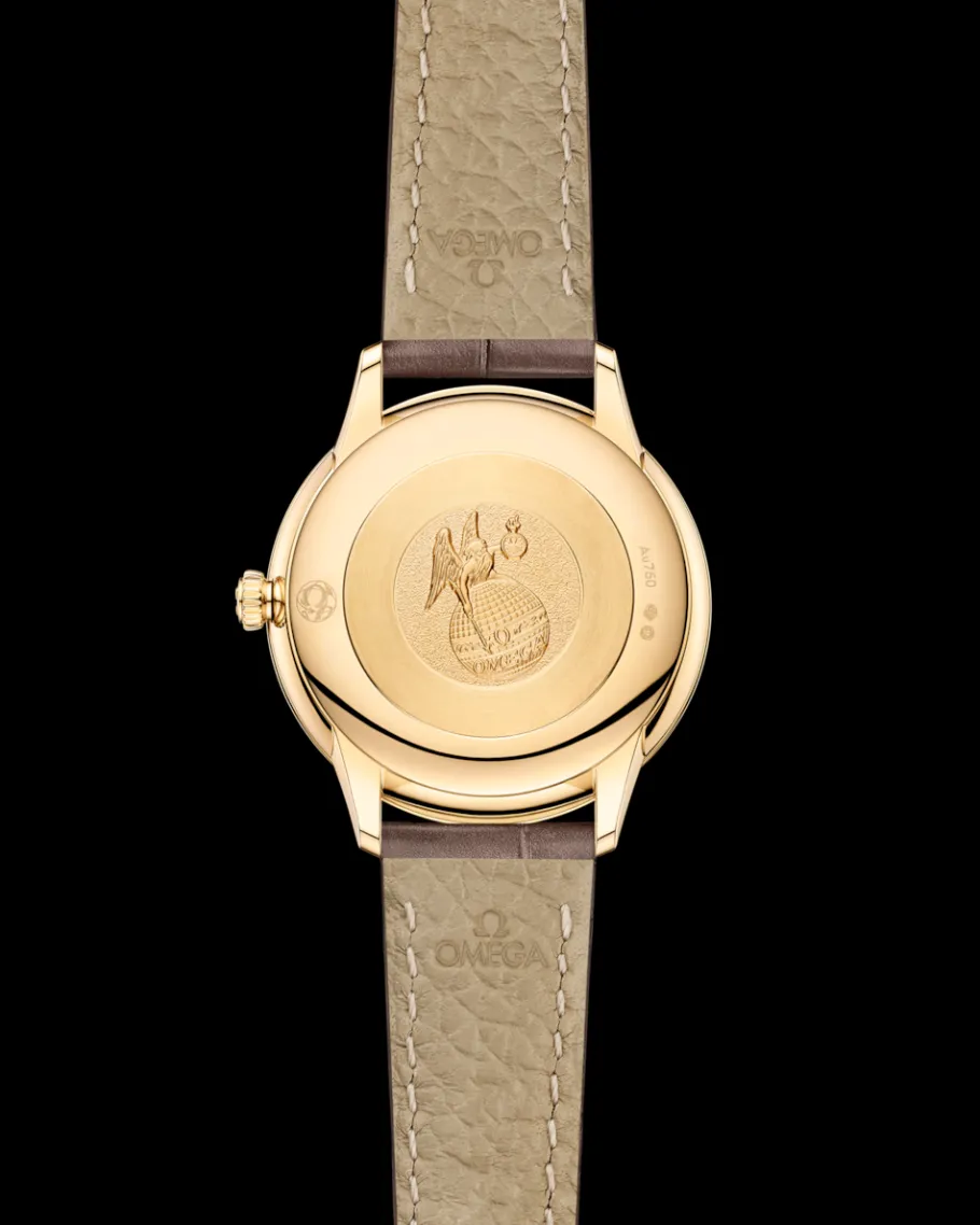 Cette montre est montée sur un magnifique bracelet en cuir brun-taupe et est animée par le calibre à quartz OMEGA 4061, équipé d’une pile d’une durée de vie d’au moins 48 mois.