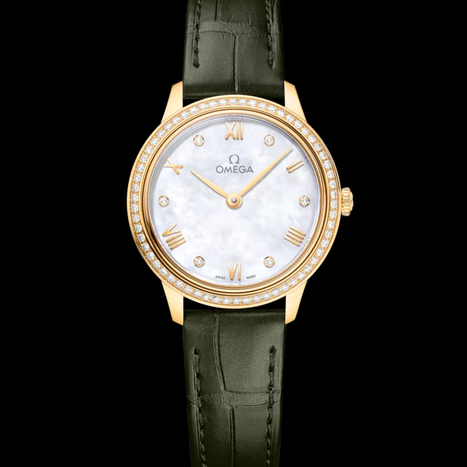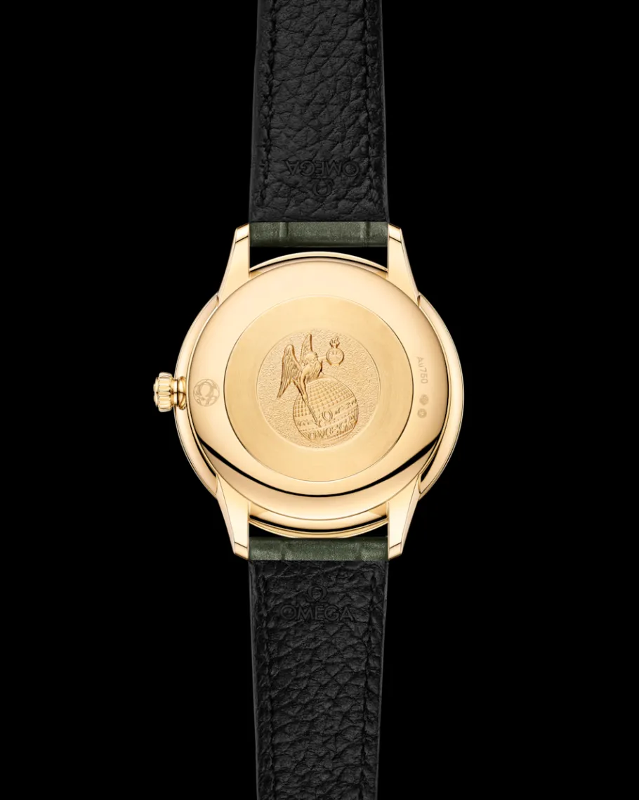 Cette montre est montée sur un magnifique bracelet en cuir vert olive et est animée par le calibre à quartz OMEGA 4061, équipé d’une pile d’une durée de vie d’au moins 48 mois.