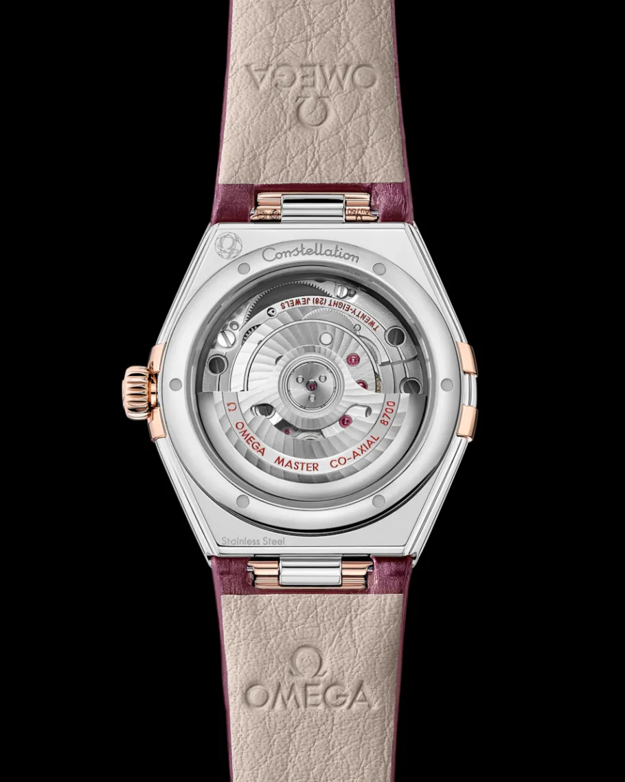La montre est présentée sur un étincelant bracelet en cuir bordeaux et animée par le calibre OMEGA Co-Axial Master Chronometer 8700, visible à travers le fond de boîte en verre saphir.