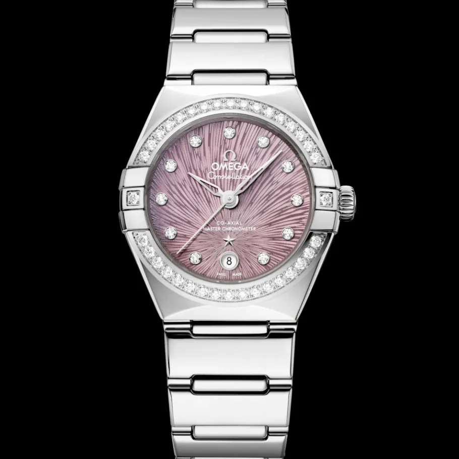 Ce modèle en acier inoxydable de 29 mm arbore une lunette éclatante pavée de diamants. Le cadran en PVD lilas est orné d’un motif Supernova unique réalisé par gravure électrochimique, ainsi que d’un guichet de date à 6 heures, d’aiguilles et d’une étoile en or blanc 18K, et d’index en diamants avec chatons en or blanc 18K.