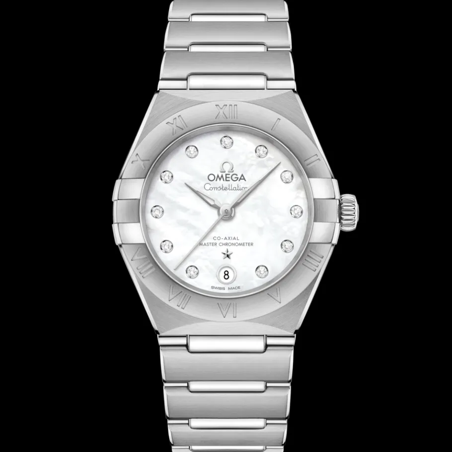 Ce modèle en acier inoxydable de 29 mm arbore une lunette gravée de chiffres romains, un cadran en nacre perlée, des index sertis de diamants et un guichet de date à 6 heures. Les aiguilles, le logo OMEGA, l’étoile Constellation et les chatons des diamants sont façonnés en or blanc 18K.