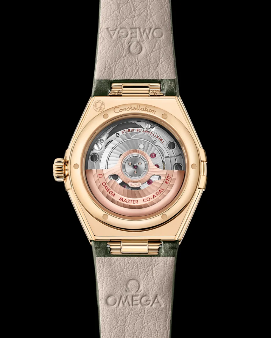 La montre est présentée sur un étincelant bracelet en cuir vert et animée par le calibre OMEGA Co-Axial Master Chronometer 8701, visible à travers le fond de boîte en verre saphir.