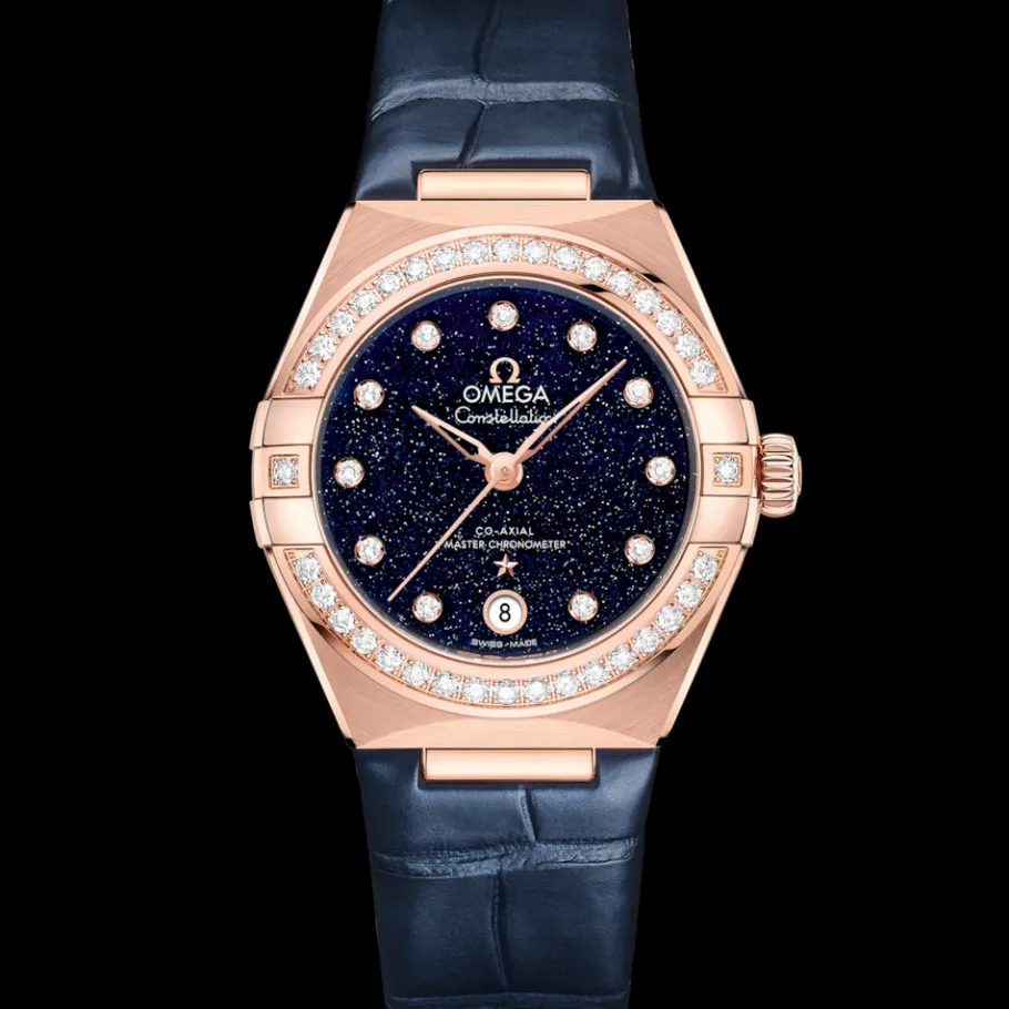 Ce modèle en or Sedna™ 18K de 29 mm arbore une lunette pavée de diamants, un cadran en verre d’aventurine bleu, des index sertis de diamants et un guichet de date à 6 heures. Les aiguilles, le logo OMEGA, l’étoile Constellation et les chatons des diamants sont également façonnés en or Sedna™ 18K.