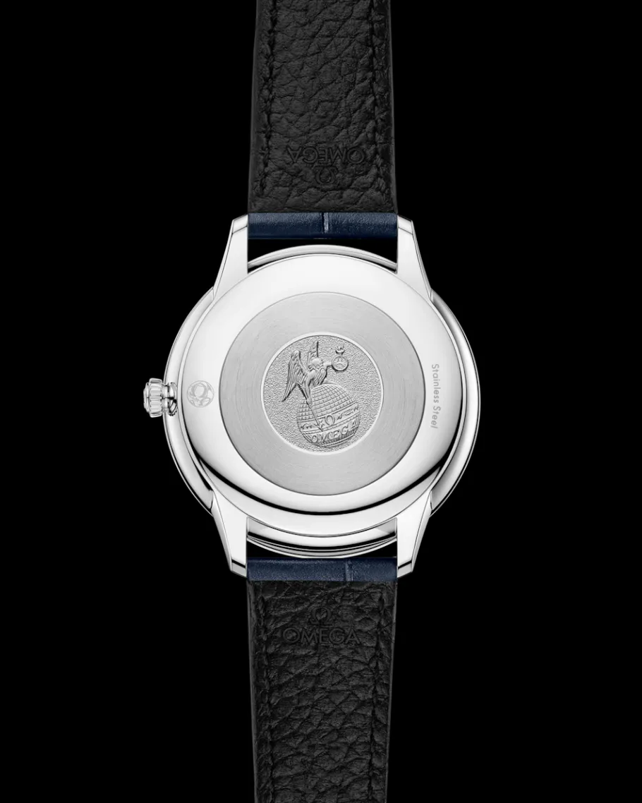 Cette montre est montée sur un magnifique bracelet en cuir bleu foncé et est animée par le calibre à quartz OMEGA 4061, équipé d’une pile d’une durée de vie d’au moins 48 mois.