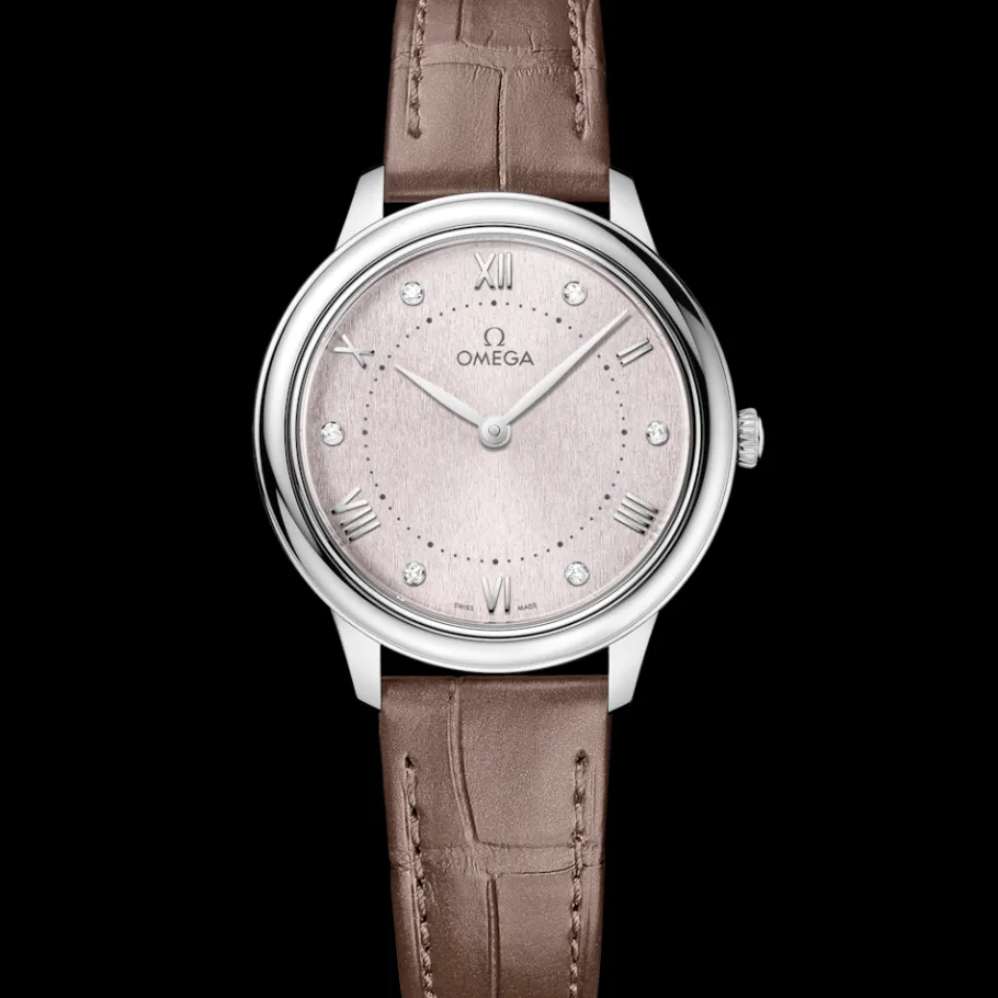 Cette montre est montée sur un magnifique bracelet en cuir brun-taupe et est animée par le calibre à quartz OMEGA 4061, équipé d’une pile d’une durée de vie d’au moins 48 mois.