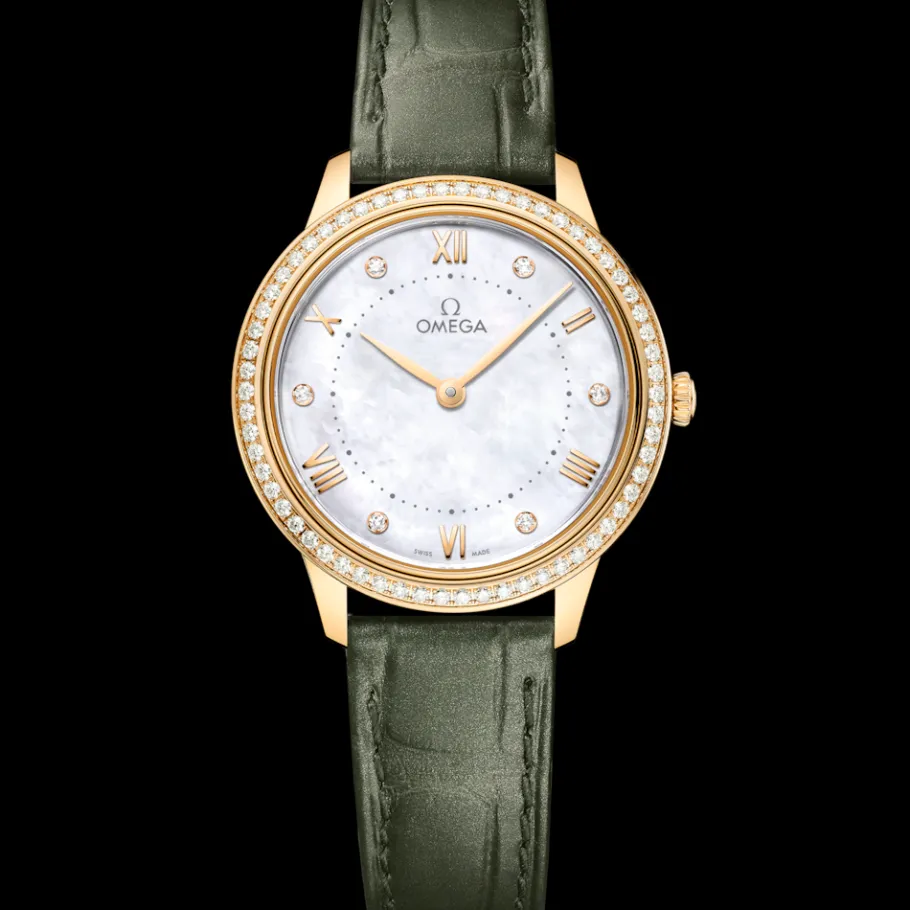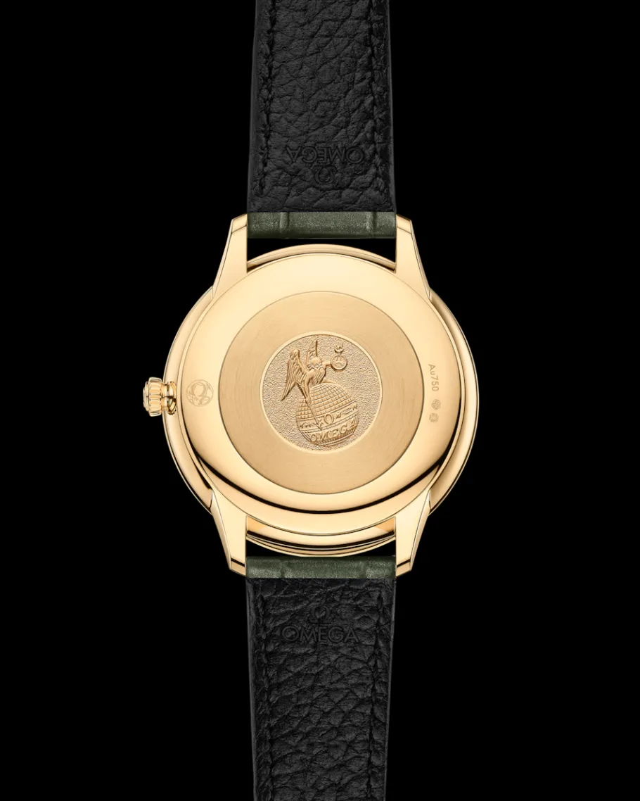 Cette montre est montée sur un magnifique bracelet en cuir vert olive et est animée par le calibre à quartz OMEGA 4061, équipé d’une pile d’une durée de vie d’au moins 48 mois.