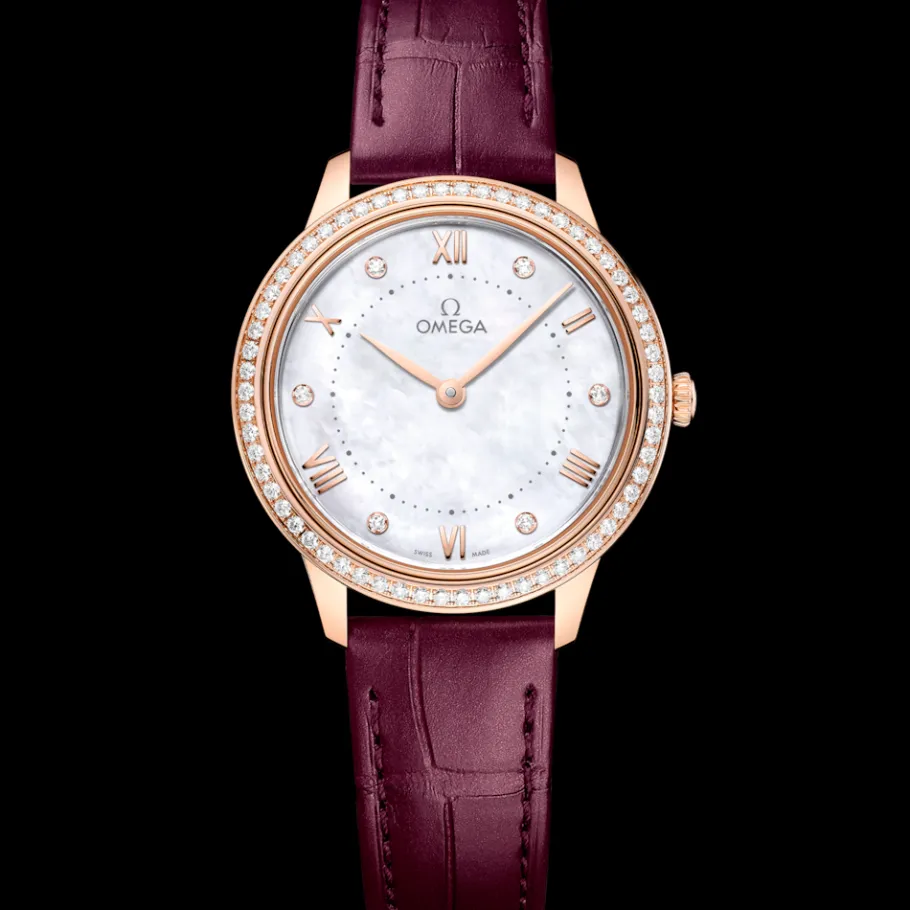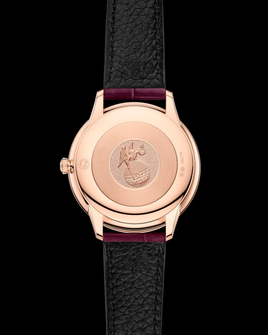 Cette montre est montée sur un magnifique bracelet en cuir bordeaux et est animée par le calibre à quartz OMEGA 4061, équipé d’une pile d’une durée de vie d’au moins 48 mois.