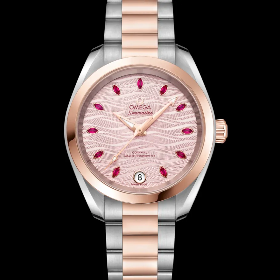 La superbe Seamaster de 34 mm signée OMEGA présente un boîtier symétrique en acier inoxydable et en or Sedna™ 18K, ainsi qu’une lunette polie. Le cadran rose pâle est estampillé de vagues et possède des aiguilles centrales des heures, des minutes et des secondes en or Sedna™ 18K poli au diamant, ainsi qu’un guichet de date à 6 heures et 11 index en rubis taille marquise.