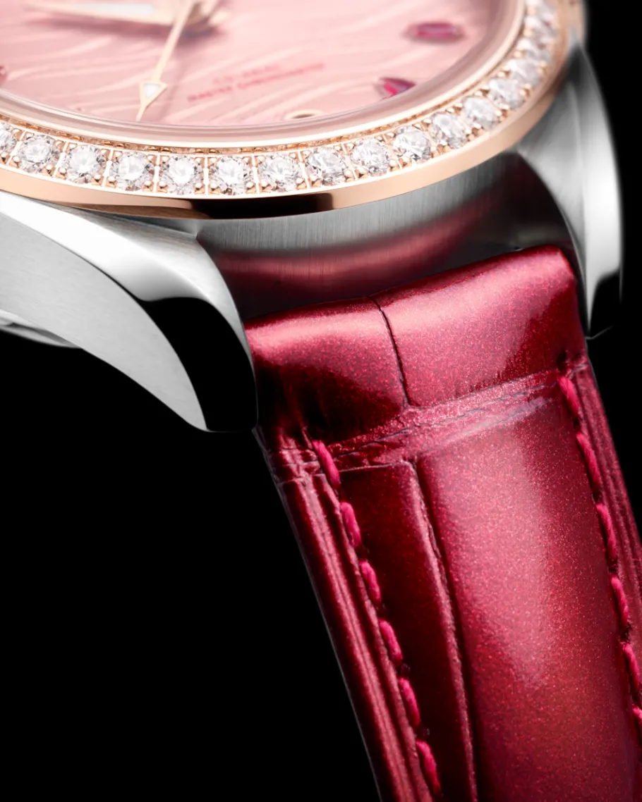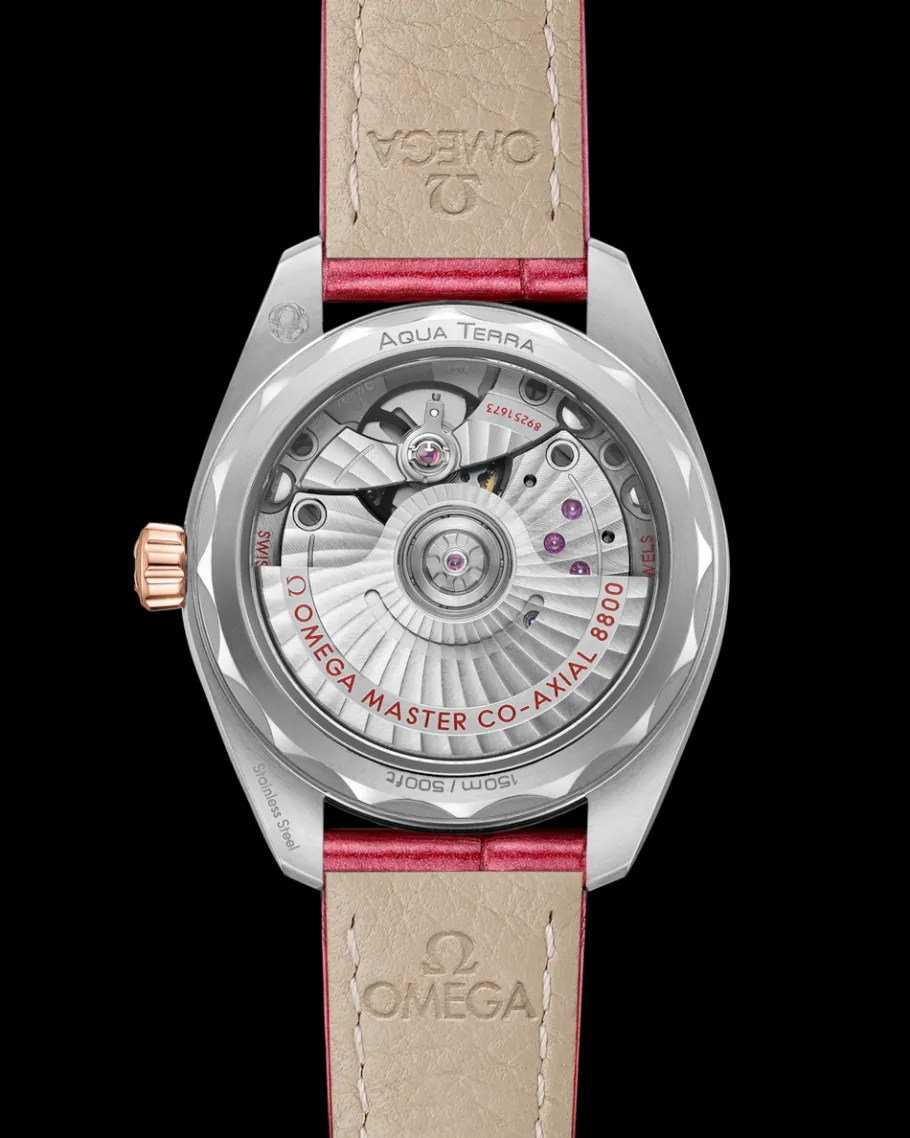 Présentée sur un bracelet en cuir rouge chatoyant, cette montre est entraînée par le calibre OMEGA Co-Axial Master Chronometer 8800 qui répond aux critères de performance les plus élevés de l’industrie horlogère, déterminés par l’Institut Fédéral Suisse de Métrologie (METAS).
