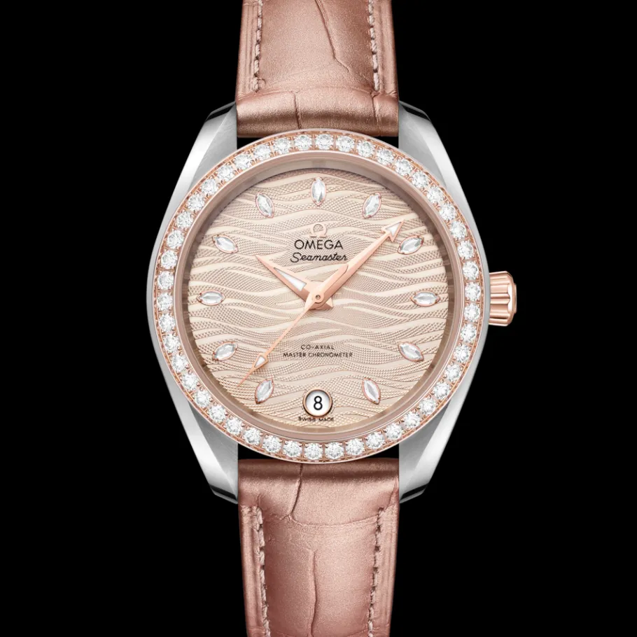 La superbe Seamaster de 34 mm signée OMEGA présente un boîtier symétrique en acier inoxydable et en or Sedna™ 18K, ainsi qu’une lunette polie sertie de diamants. Le cadran nude est estampillé de vagues et possède des aiguilles centrales des heures, des minutes et des secondes en or Sedna™ 18K poli au diamant, ainsi qu’un guichet de date à 6 heures et 11 index en diamants taille marquise.