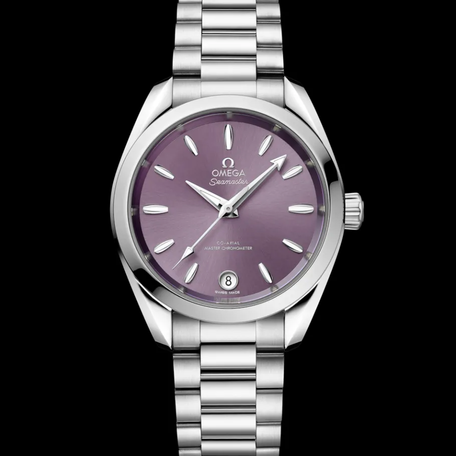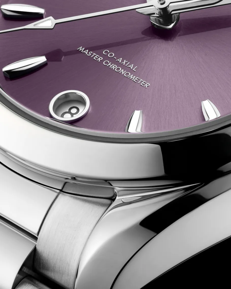 Le cadran couleur lavande, façonné à partir de laiton, est revêtu de laque et soleillé à partir du centre. Le guichet de date à 6 heures, les aiguilles, les index et le logo OMEGA sont façonnés en or blanc 18K poli au diamant.
