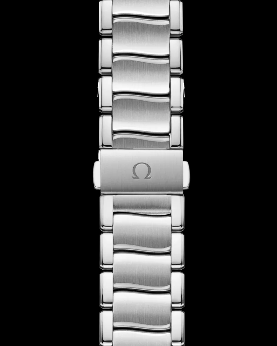 Un guichet de date est placé à 3 heures, tandis que l’intérieur abrite le calibre OMEGA Co-Axial 8520.