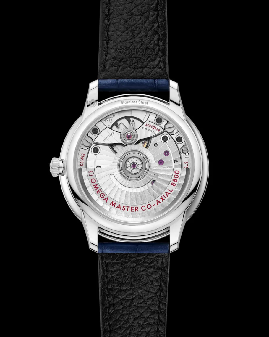 Cette montre certifiée Master Chronometer est montée sur un magnifique bracelet en cuir bleu clair et est animée par le calibre OMEGA Master Co-Axial 8800, que l’on peut admirer à travers le fond de boîte en verre saphir inrayable.