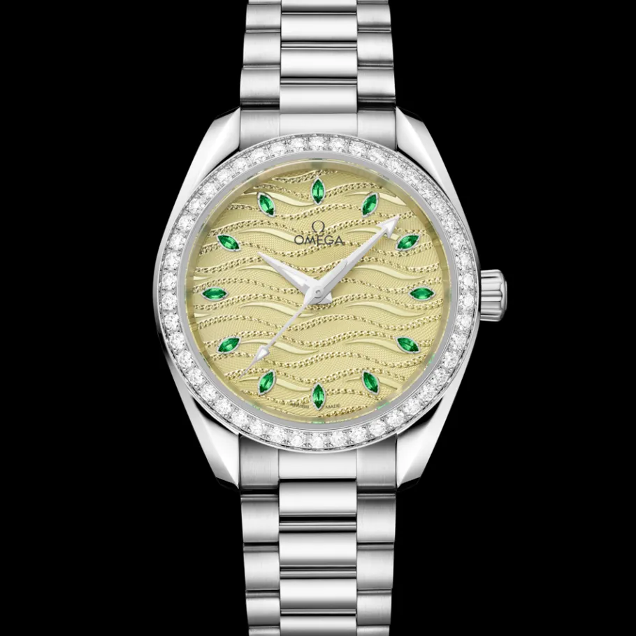 La Seamaster Aqua Terra est un magnifique hommage au vaste patrimoine maritime d’OMEGA. Parmi les quatre montres de 34 mm célébrant les couleurs de la saison, ce modèle présente un boîtier symétrique en Canopus Gold™ 18K poli, une lunette pavée de diamants et un fond de boîte orné d’un motif alvéolé.