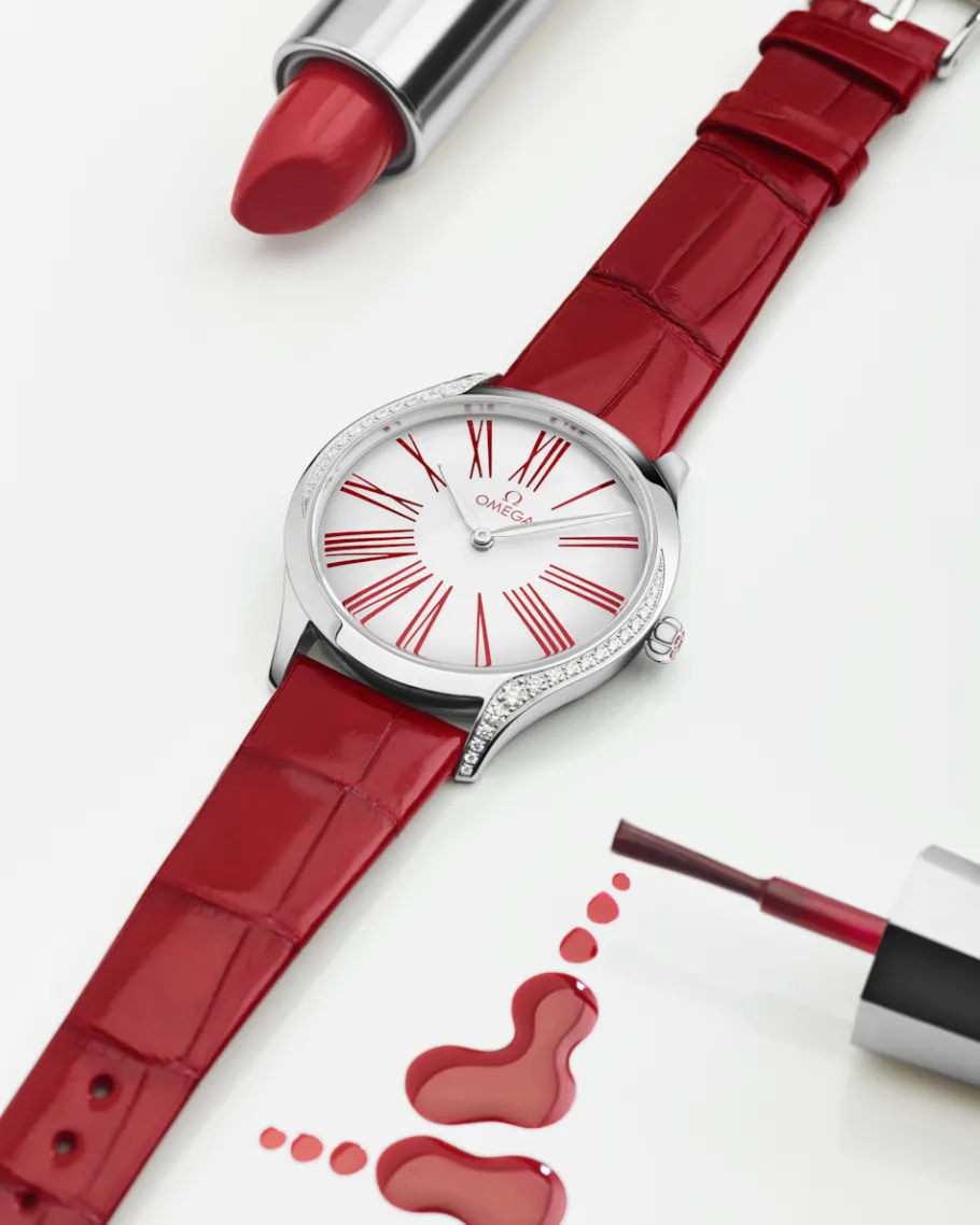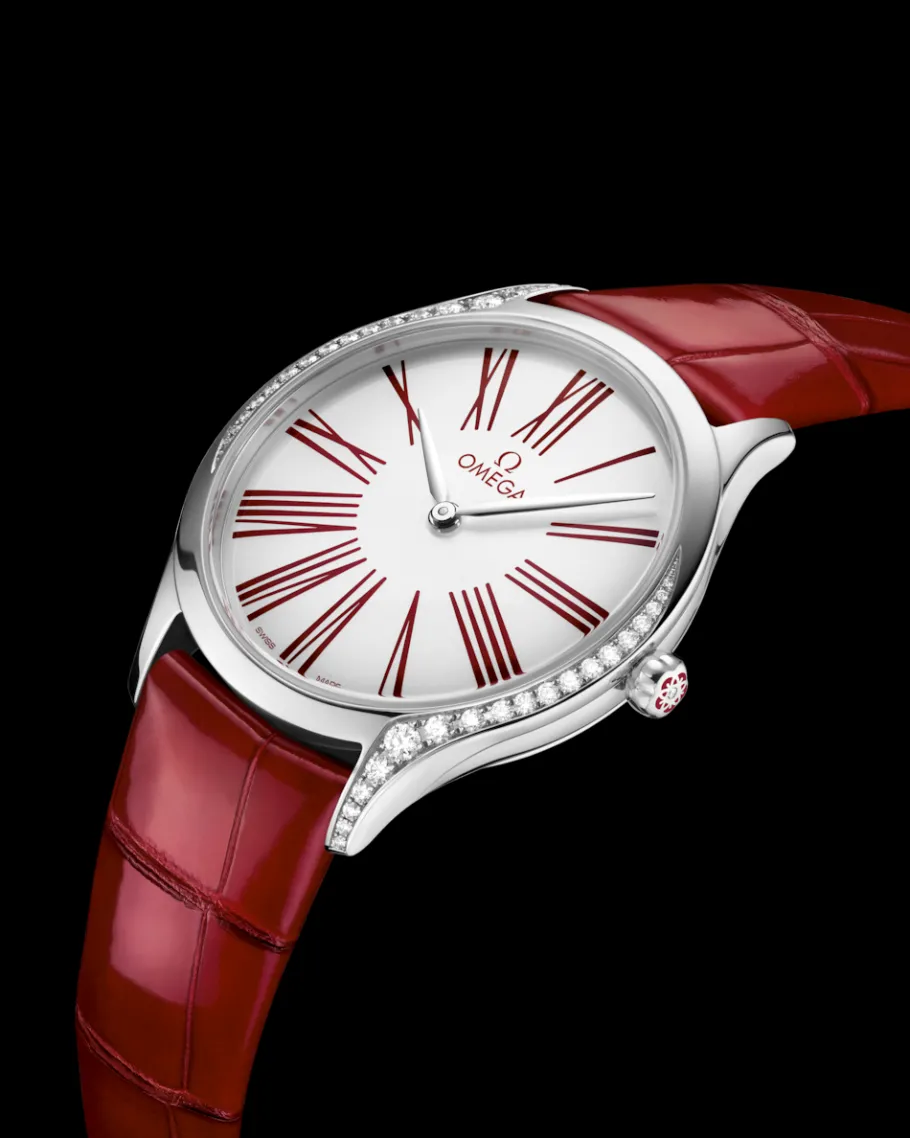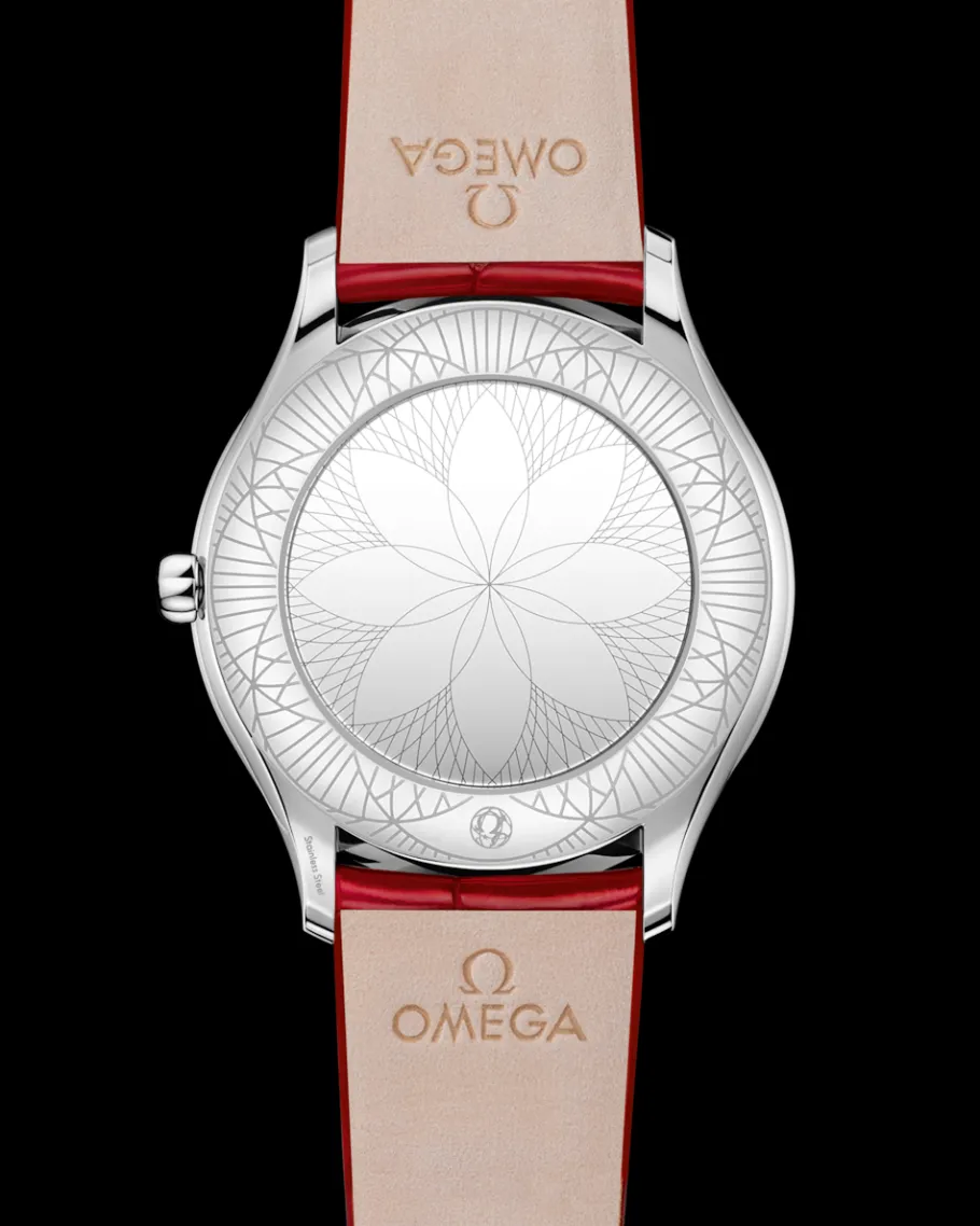 Ce modèle arbore un boîtier plat de 36 mm en acier inoxydable orné d’élégantes volutes serties de 38 diamants taille brillant. Le cadran laqué blanc arbore des chiffres romains rouges appliqués en décalque. La couronne est quant à elle surmontée d’un unique diamant, entouré d’une fleur en céramique rouge constituée de cinq logos OMEGA.