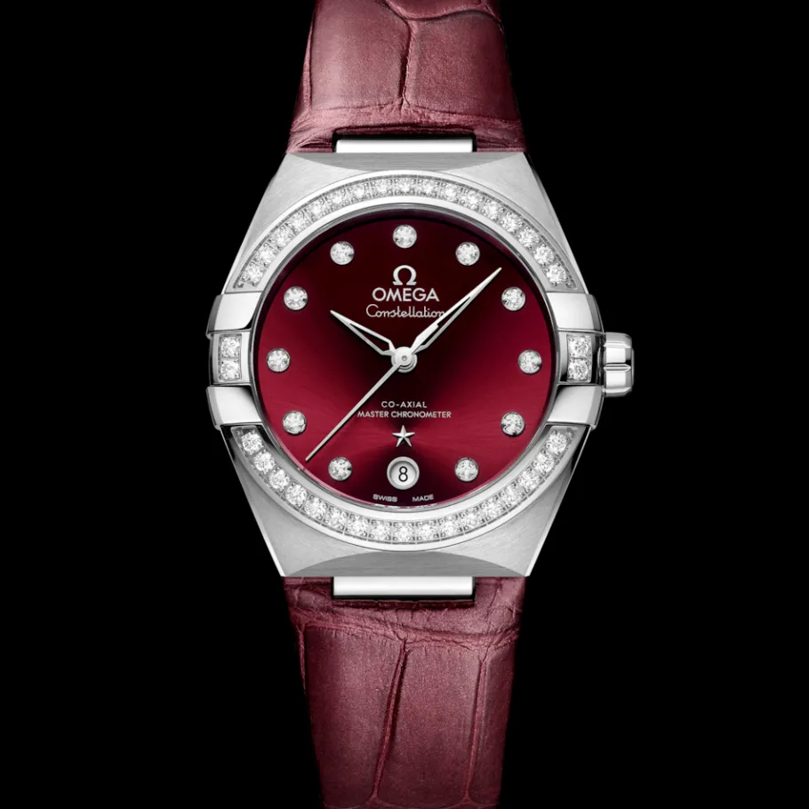Ce modèle en acier inoxydable de 36 mm arbore une lunette polie sertie de 38 diamants, un cadran bordeaux traité PVD avec finition soleillée et un guichet de date à 6 heures. Les aiguilles, le logo OMEGA, l’étoile Constellation et les index sont en or blanc 18K.