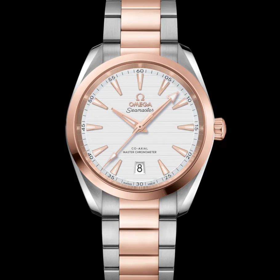La Seamaster Aqua Terra constitue un magnifique hommage au vaste patrimoine maritime d’OMEGA. Au verso, le boîtier symétrique de 38 mm, façonné en or Sedna™ 18K et acier inoxydable, est orné d’un motif vagues.