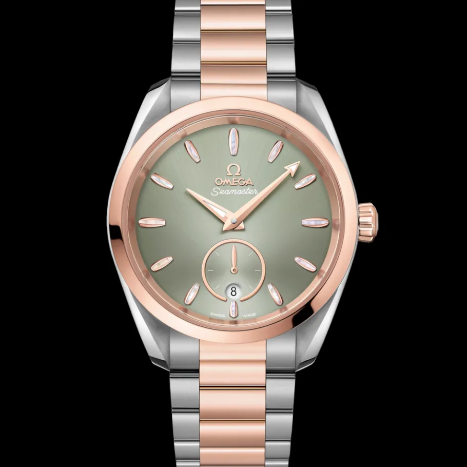 La Seamaster Aqua Terra constitue un magnifique hommage au vaste patrimoine maritime d’OMEGA. Au verso, le boîtier symétrique de 38 mm, façonné en or Sedna™ 18K et acier inoxydable, est orné d’un motif vagues.