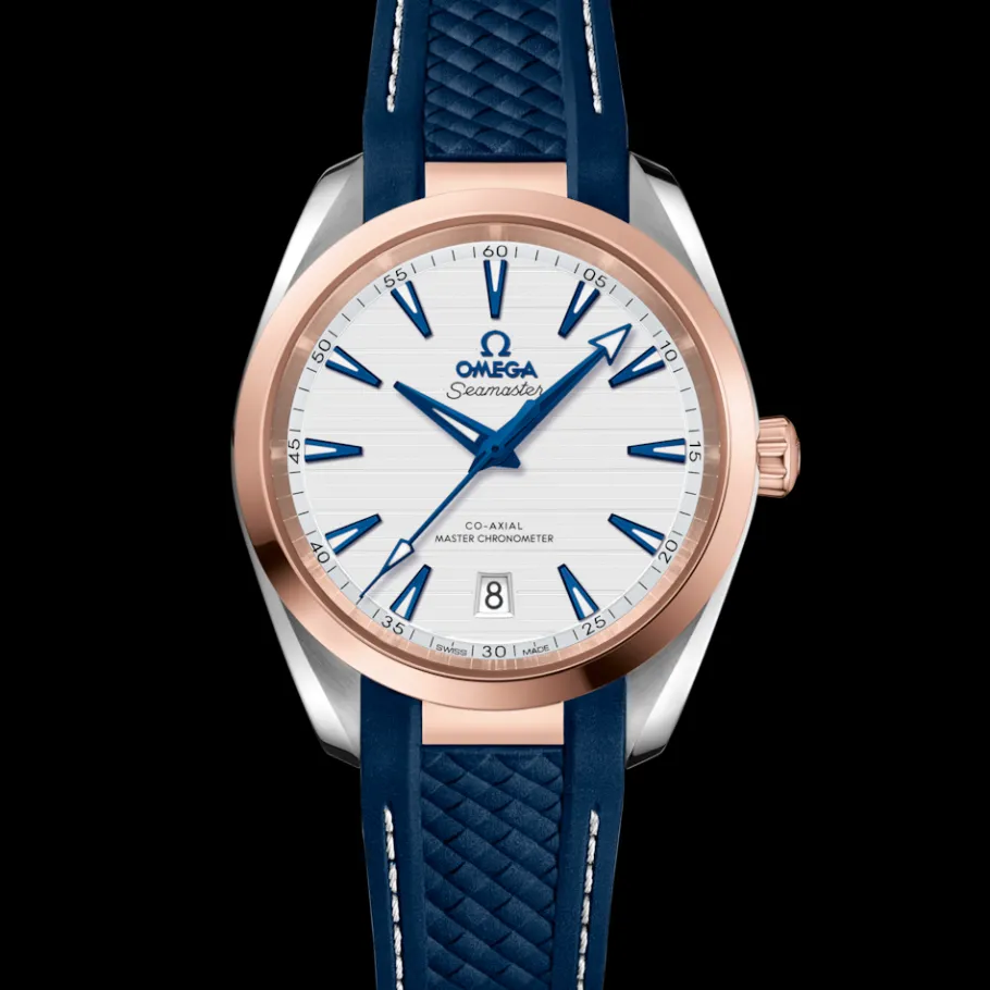 La Seamaster Aqua Terra constitue un magnifique hommage au vaste patrimoine maritime d’OMEGA. Au verso, le boîtier symétrique de 38 mm, façonné en or Sedna™ 18K et acier inoxydable, est orné d’un motif vagues.
