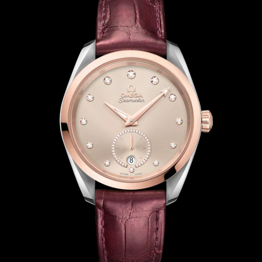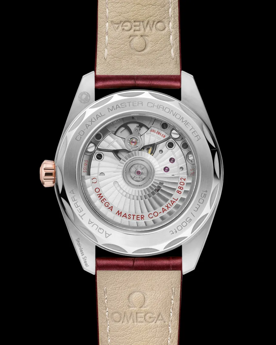 Présentée sur un bracelet en cuir bordeaux, cette montre est entraînée par le calibre OMEGA Co-Axial Master Chronometer 8802 qui répond aux critères de performance les plus élevés de l’industrie horlogère, déterminés par l’Institut Fédéral Suisse de Métrologie (METAS).