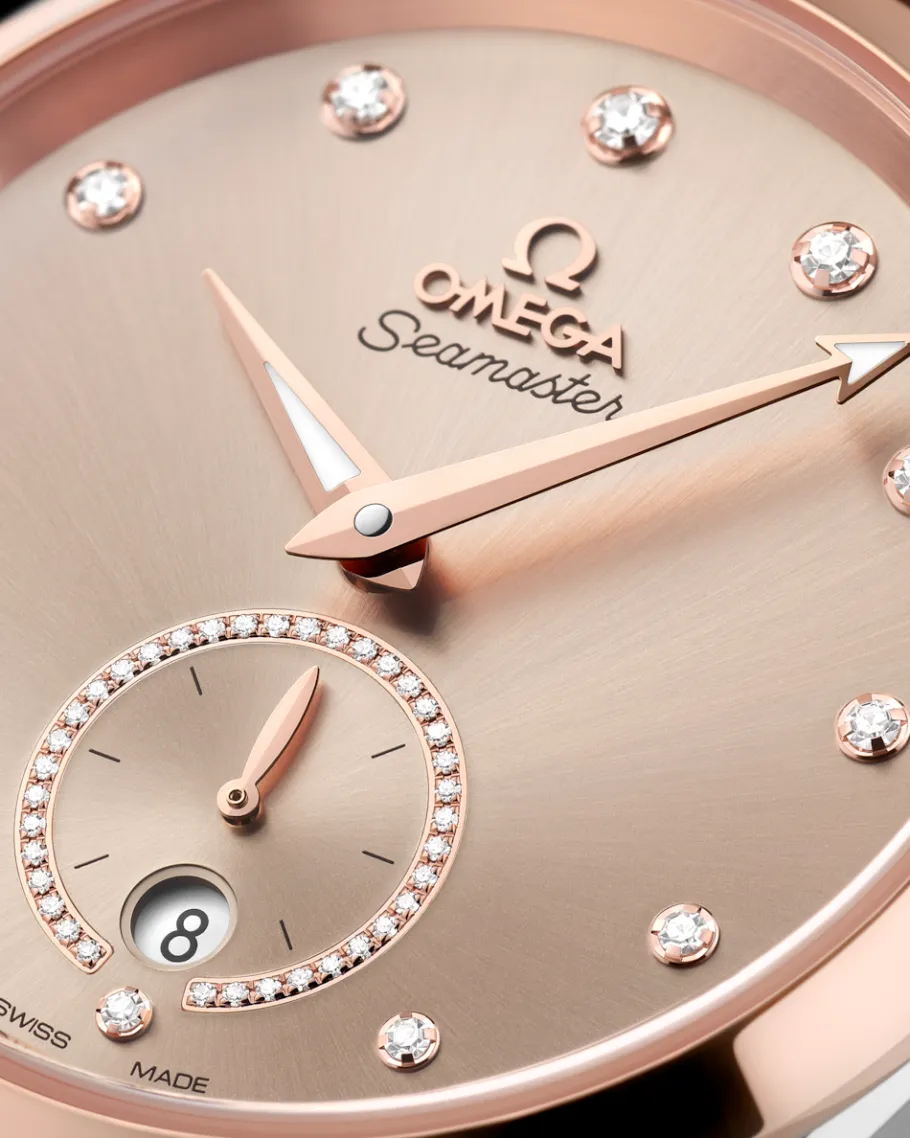 Le cadran soleillé couleur lin arbore un guichet de date à 6 heures et un compteur de la petite seconde orné d’un anneau en or Sedna™ 18K serti de diamants. Le modèle est rehaussé d’aiguilles en or Sedna™ 18K revêtus de Super-LumiNova blanc, ainsi que d’index incrémentaux en diamants présentés sur des chatons en or Sedna™ 18K.