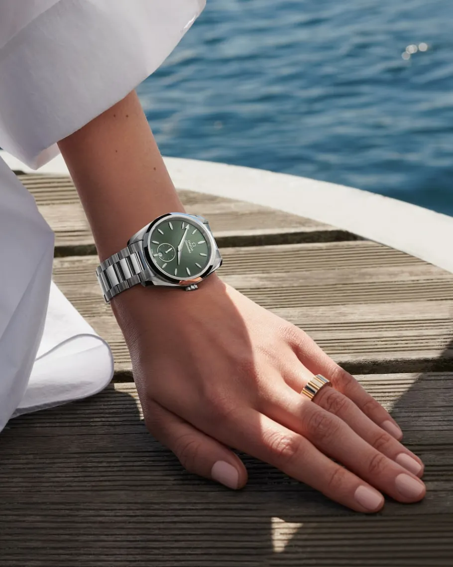 Le cadran soleillé vert foncé arbore un guichet de date à 6 heures et un compteur de la petite seconde orné d’un anneau en or blanc 18K. Le modèle est rehaussé d’aiguilles rhodiées revêtues de Super-LumiNova blanc, ainsi que d’index en or blanc 18K en forme de coque de bateau avec un insert en nacre iridescente.