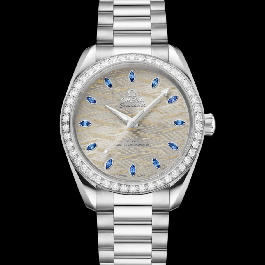 La Seamaster Aqua Terra est un magnifique hommage au vaste patrimoine maritime d’OMEGA. Parmi les quatre montres de 38 mm célébrant les couleurs de la saison, ce modèle présente un boîtier symétrique en Canopus Gold™ 18K poli, une lunette pavée de diamants et un fond de boîte orné d’un motif alvéolé.