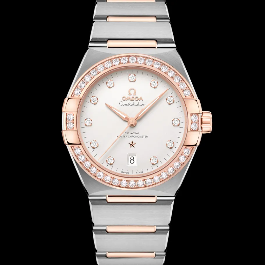 Ce modèle en acier inoxydable et or Sedna™ 18K de 39 mm arbore une lunette pavée de diamants, un cadran opalin argenté, des index sertis de diamants et un guichet de date à 6 heures. Les aiguilles, le logo OMEGA, l’étoile Constellation et les chatons des diamants qui habillent le cadran sont en or Sedna™ 18K.