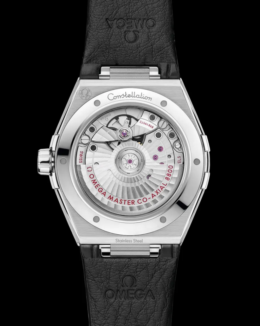 Présentée sur un bracelet en cuir noir, cette montre abrite un calibre OMEGA Co-Axial Master Chronometer 8800, visible à travers le fond du boîtier en verre saphir bombé résistant aux rayures.