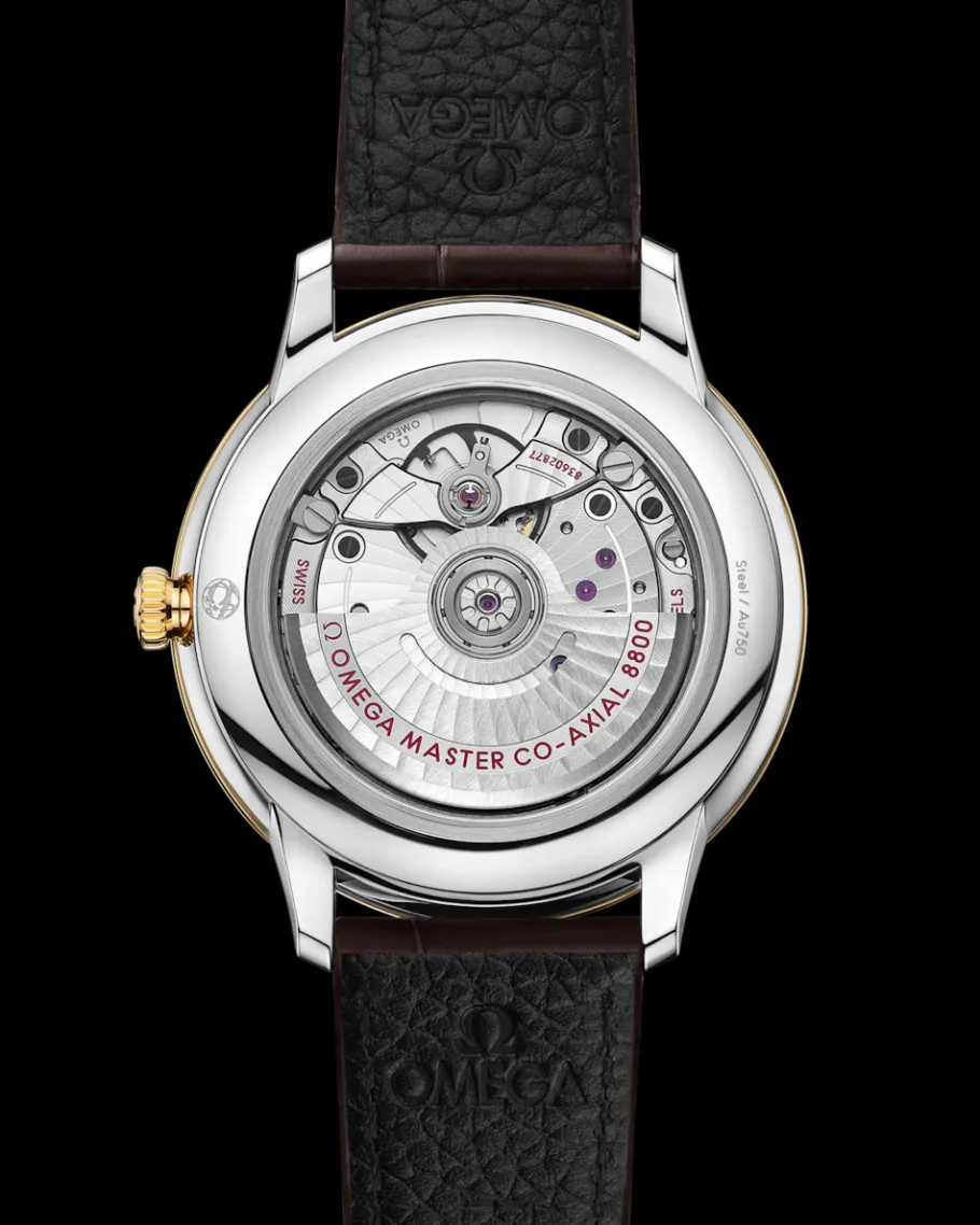 Cette montre certifiée Master Chronometer est montée sur un bracelet en cuir brun et est animée par le calibre OMEGA Master Co-Axial 8800, que l’on peut admirer à travers le fond de boîte en verre saphir inrayable.