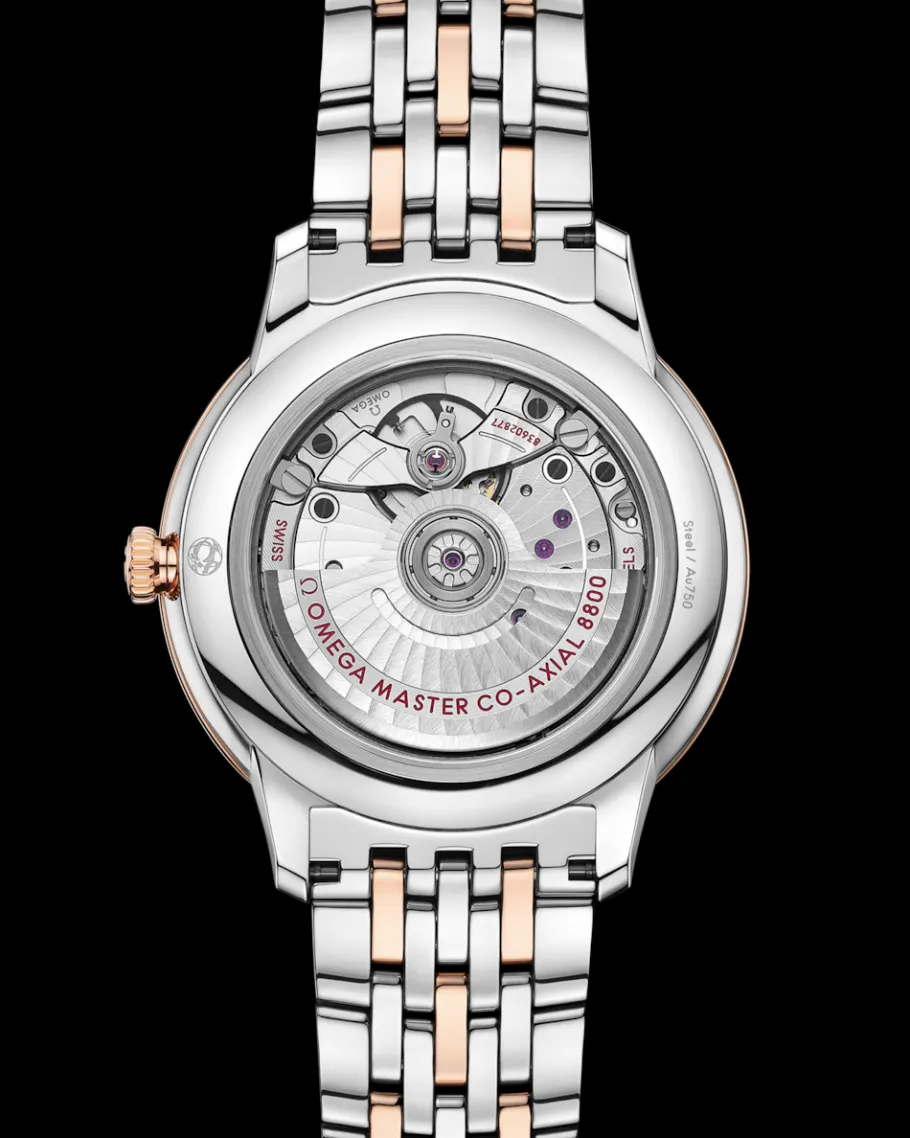 Cette montre certifiée Master Chronometer est montée sur un bracelet en acier inoxydable et or Sedna™ et est animée par le calibre OMEGA Master Co-Axial 8800, que l’on peut admirer à travers le fond de boîte en verre saphir inrayable.