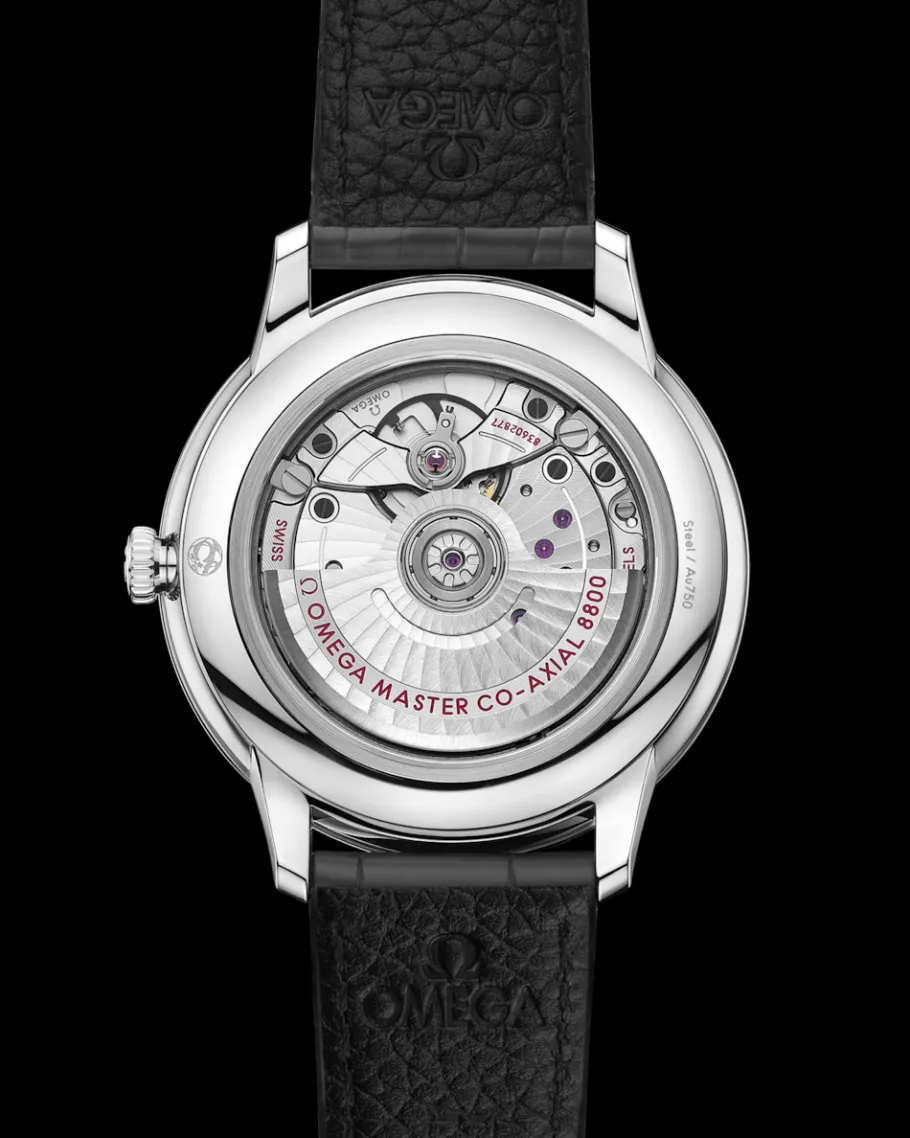 Cette montre certifiée Master Chronometer est montée sur un bracelet en cuir gris foncé et est animée par le calibre OMEGA Master Co-Axial 8800, que l’on peut admirer à travers le fond de boîte en verre saphir inrayable.