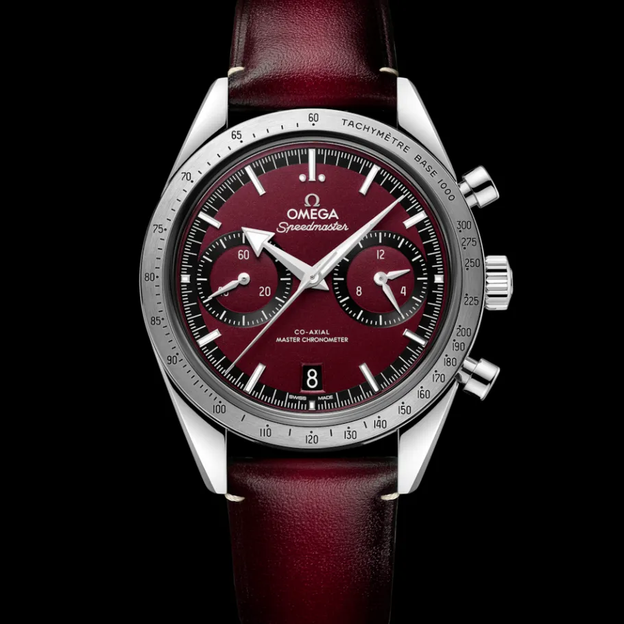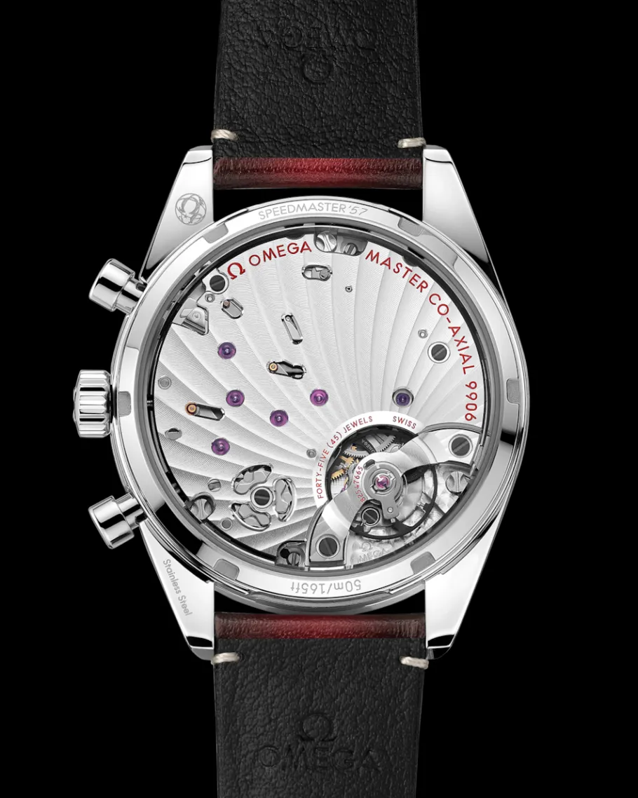 La montre est proposée avec un bracelet en cuir bordeaux orné du logo OMEGA en relief sur la boucle, et est animée par le calibre OMEGA Co-Axial Master Chronometer 9906 à remontage manuel.