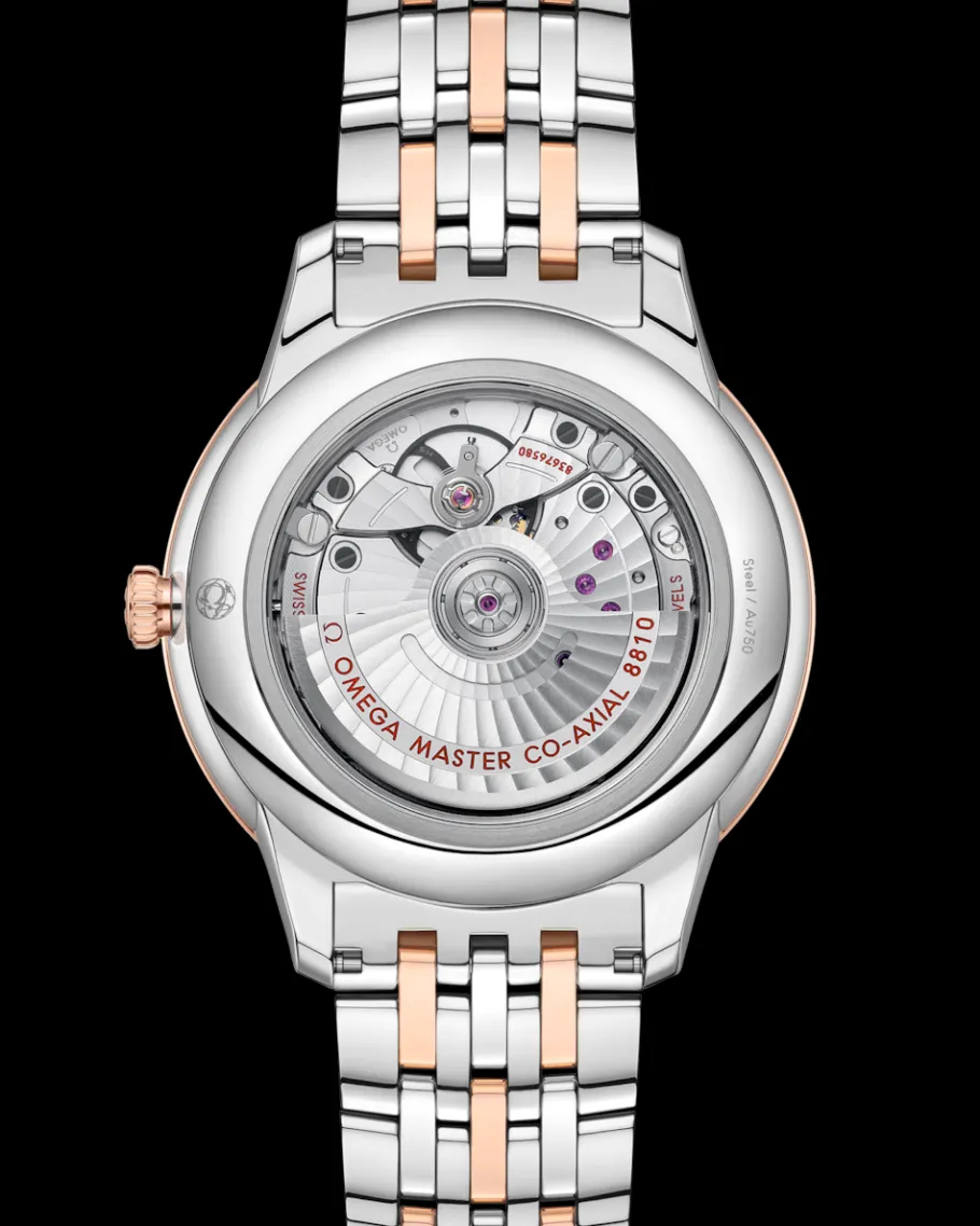 Cette montre certifiée Master Chronometer est montée sur un bracelet en acier inoxydable et or Sedna™ et est animée par le calibre OMEGA Master Co-Axial 8810, que l’on peut admirer à travers le fond de boîte en verre saphir inrayable.