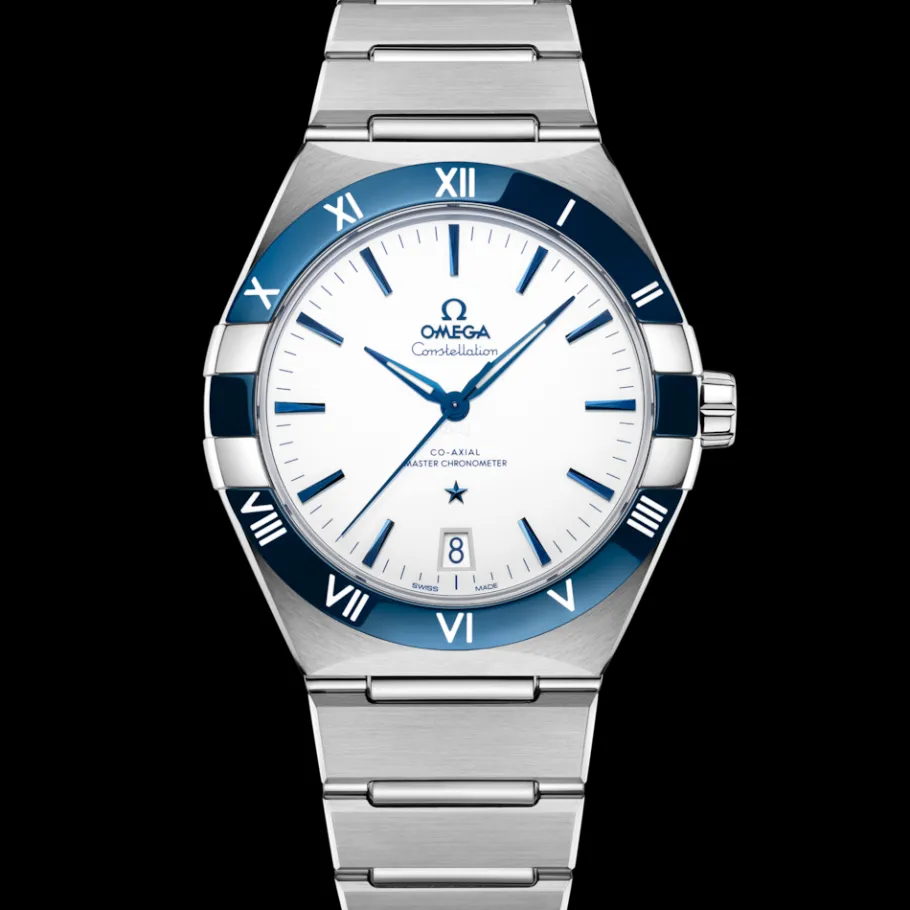 Ce modèle de 41 mm en acier inoxydable arbore une lunette en céramique bleue polie ornée de chiffres romains en émail blanc « Grand Feu », un cadran en céramique blanche et un guichet de date à 6 heures. Les aiguilles, le logo OMEGA, l’étoile Constellation et les index facettés sont de couleur bleue.