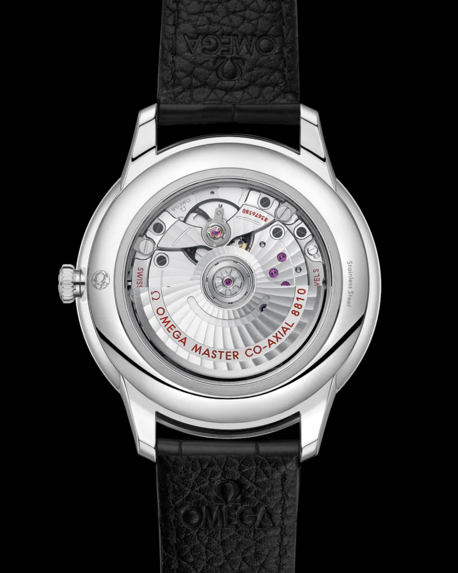 Cette montre certifiée Master Chronometer est montée sur un bracelet en cuir noir et est animée par le calibre OMEGA Master Co-Axial 8810, que l’on peut admirer à travers le fond de boîte en verre saphir inrayable.