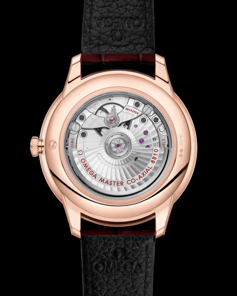 Cette montre certifiée Master Chronometer est montée sur un bracelet en cuir bordeaux et est animée par le calibre OMEGA Master Co-Axial 8810, que l’on peut admirer à travers le fond de boîte en verre saphir inrayable.