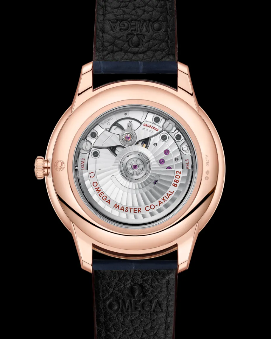 Cette montre certifiée Master Chronometer est montée sur un bracelet en cuir bleu foncé et est animée par le calibre OMEGA Master Co-Axial 8802, que l’on peut admirer à travers le fond de boîte en verre saphir inrayable