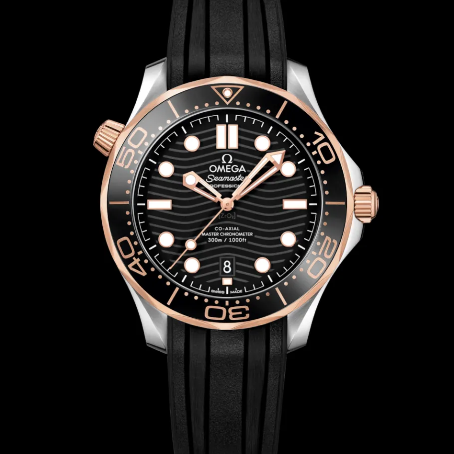 Ce modèle de 42 mm en acier inoxydable et or Sedna™ 18K est surmonté d’une lunette en céramique noire arborant une échelle de plongée en Ceragold™. Le cadran, également en céramique noire polie, est décoré de vagues gravées au laser et comporte un guichet de date à 6 heures.