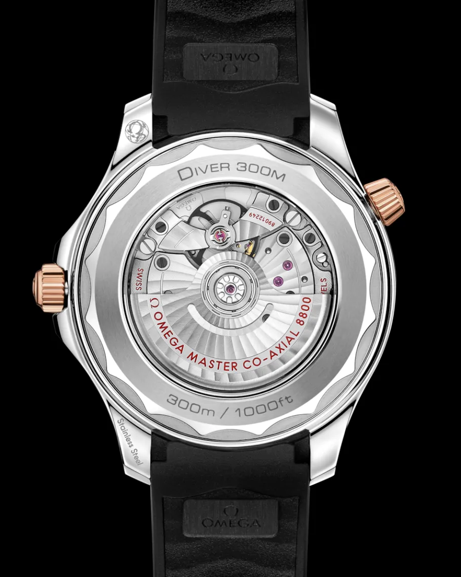 La montre est présentée sur un bracelet en caoutchouc noir et entraînée par le calibre OMEGA Master Chronometer 8800, que l’on peut admirer à travers le fond en verre saphir à bords ondulés.