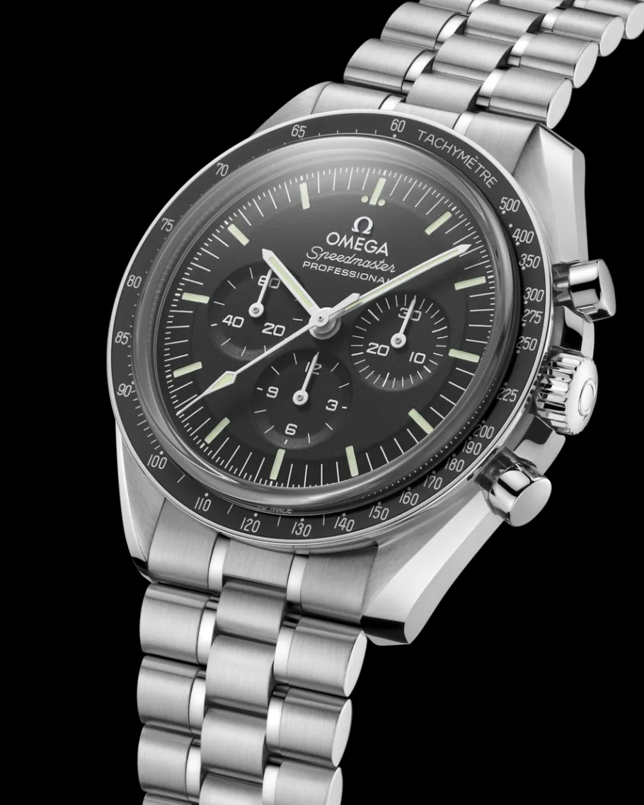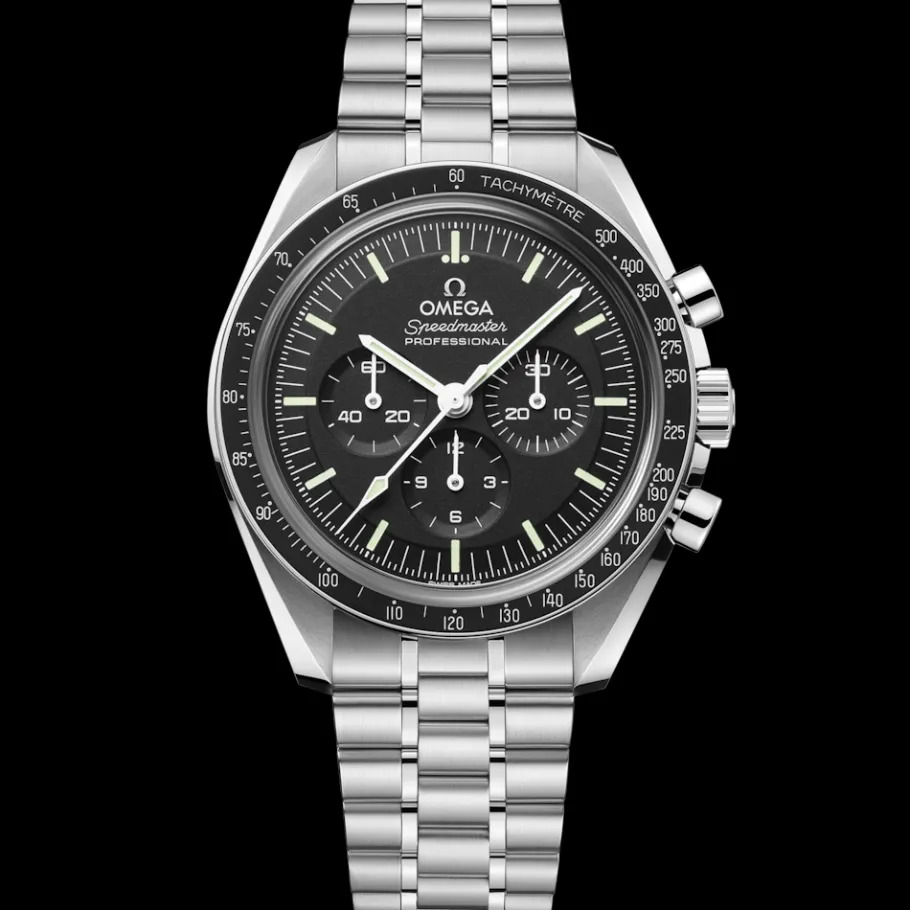 Cette Moonwatch de 42 mm en acier inoxydable est montée sur un bracelet poli et satiné composé de rangs de cinq maillons incurvés. Elle présente un verre saphir sur l’avant comme sur le fond de boîtier. Inspirée de la Speedmaster 4e génération portée sur la Lune, cette montre au boîtier asymétrique arbore un cadran noir à degrés rehaussé du logo OMEGA appliqué. La lunette en aluminium anodisé est quant à elle frappée du point signature au-dessus du chiffre 90.