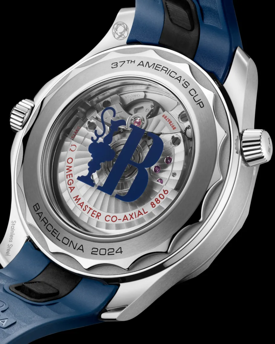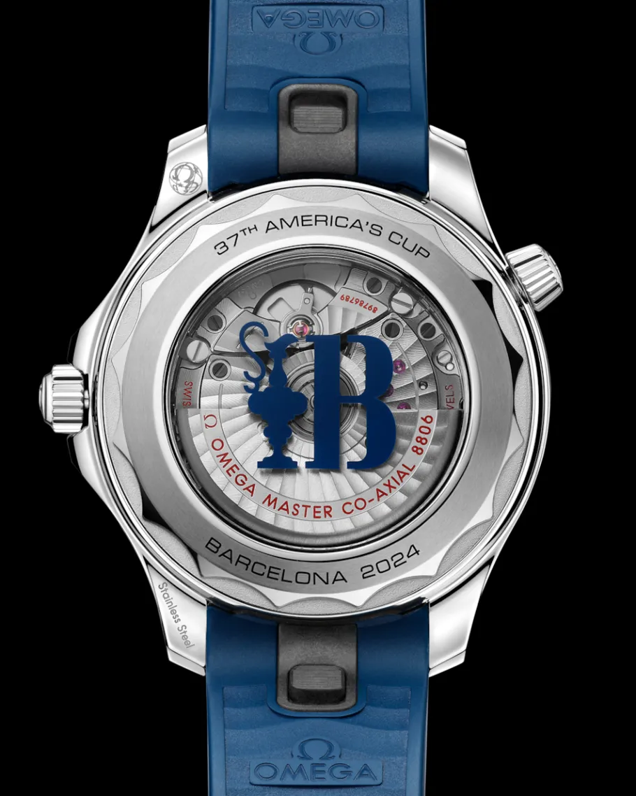 Le logo bleu caractéristique, avec l’inscription « Auld Mug » et la lettre B en référence à Barcelone, est également sur le fond de boîte en verre saphir. La montre est entraînée par le calibre OMEGA Co-Axial Master Chronometer 8806.