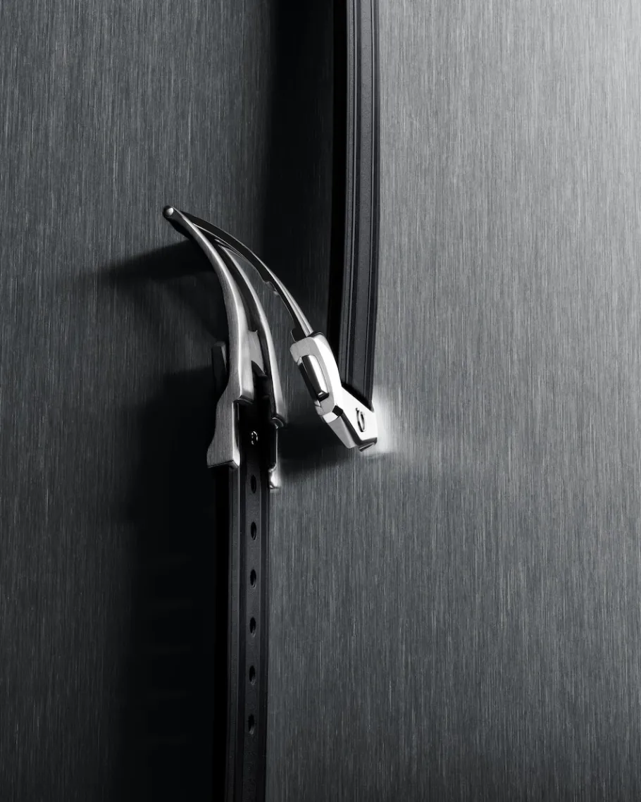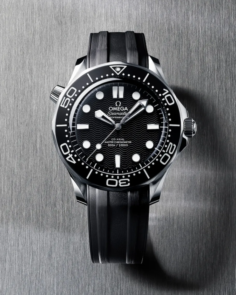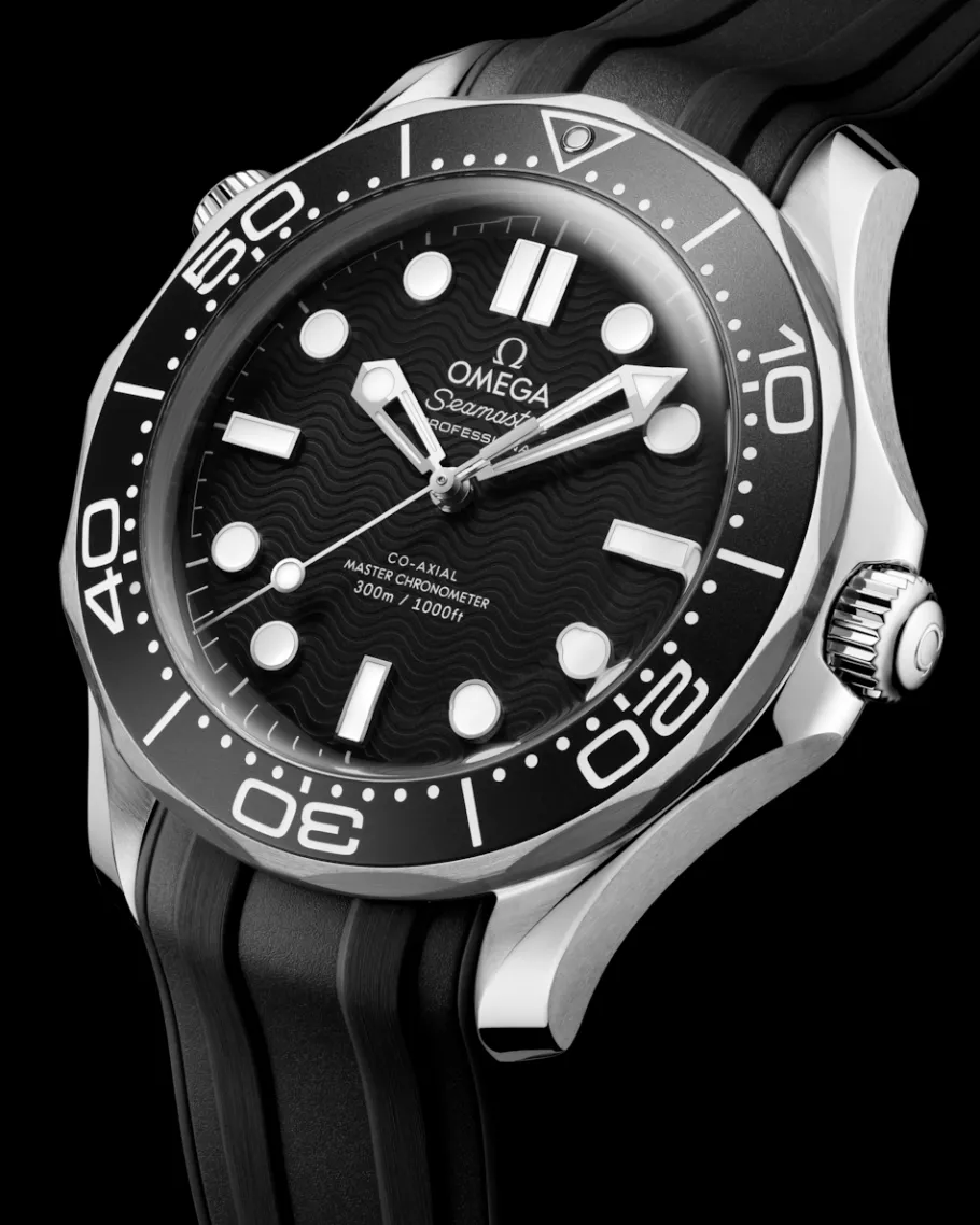 L’aluminium noir est également présent sur le cadran, décoré du motif vagues emblématique de la Seamaster Diver gravé au laser. Les aiguilles et index squelettés sont rhodiés et revêtus de Super-LumiNova blanc, tandis que les autres éléments, comme le logo OMEGA, sont réalisés en décalque blanc.